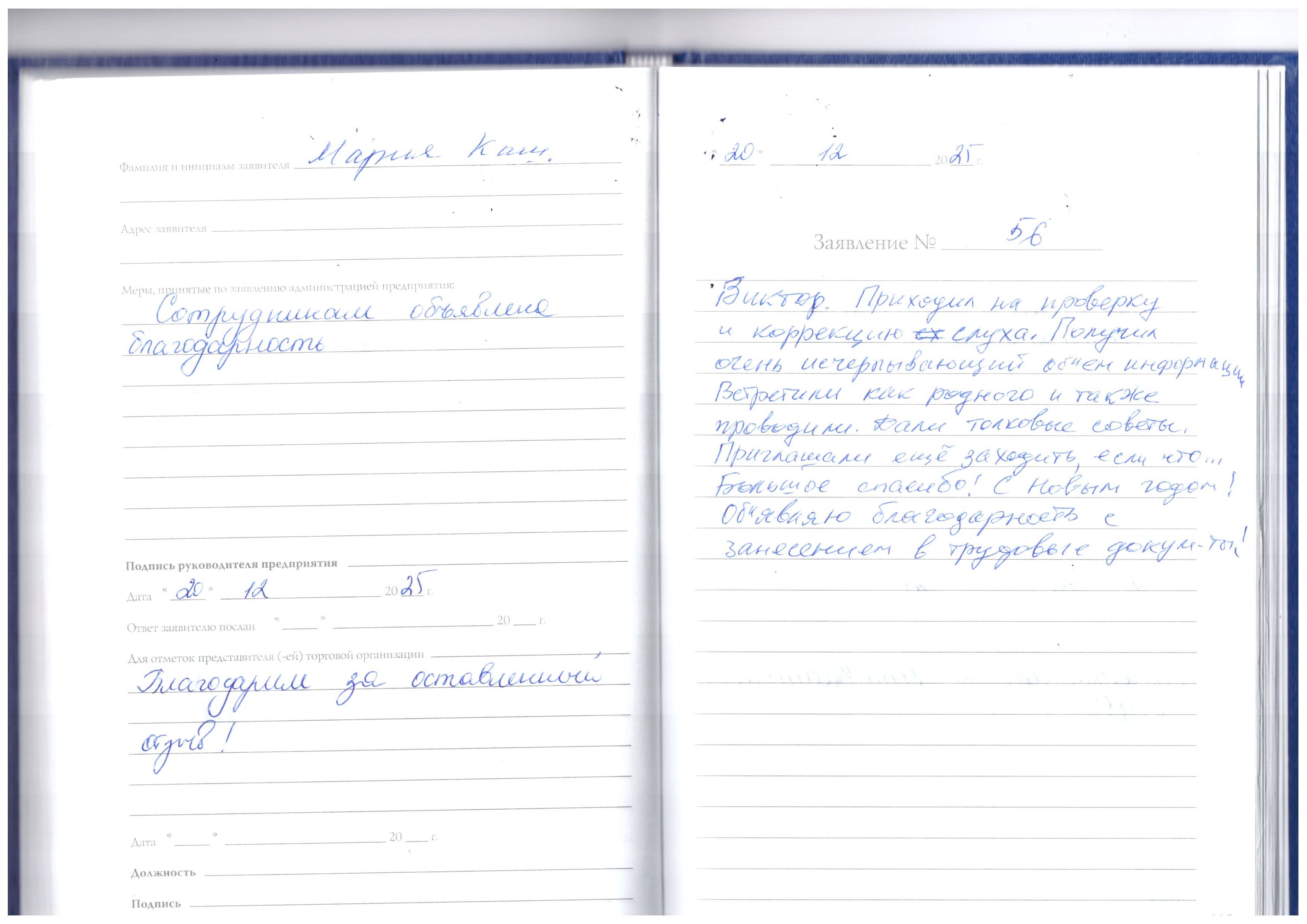 Виктор. Приходил на проверку и коррекцию слуха. Получил очень исчерпывающий объем информации. Встретили как родного и также проводили. Дали толковые советы. Приглашали еще заходить, если что... Большое спасибо! С Новым годом! Объявляю благодарность с занесением в трудовые документы!