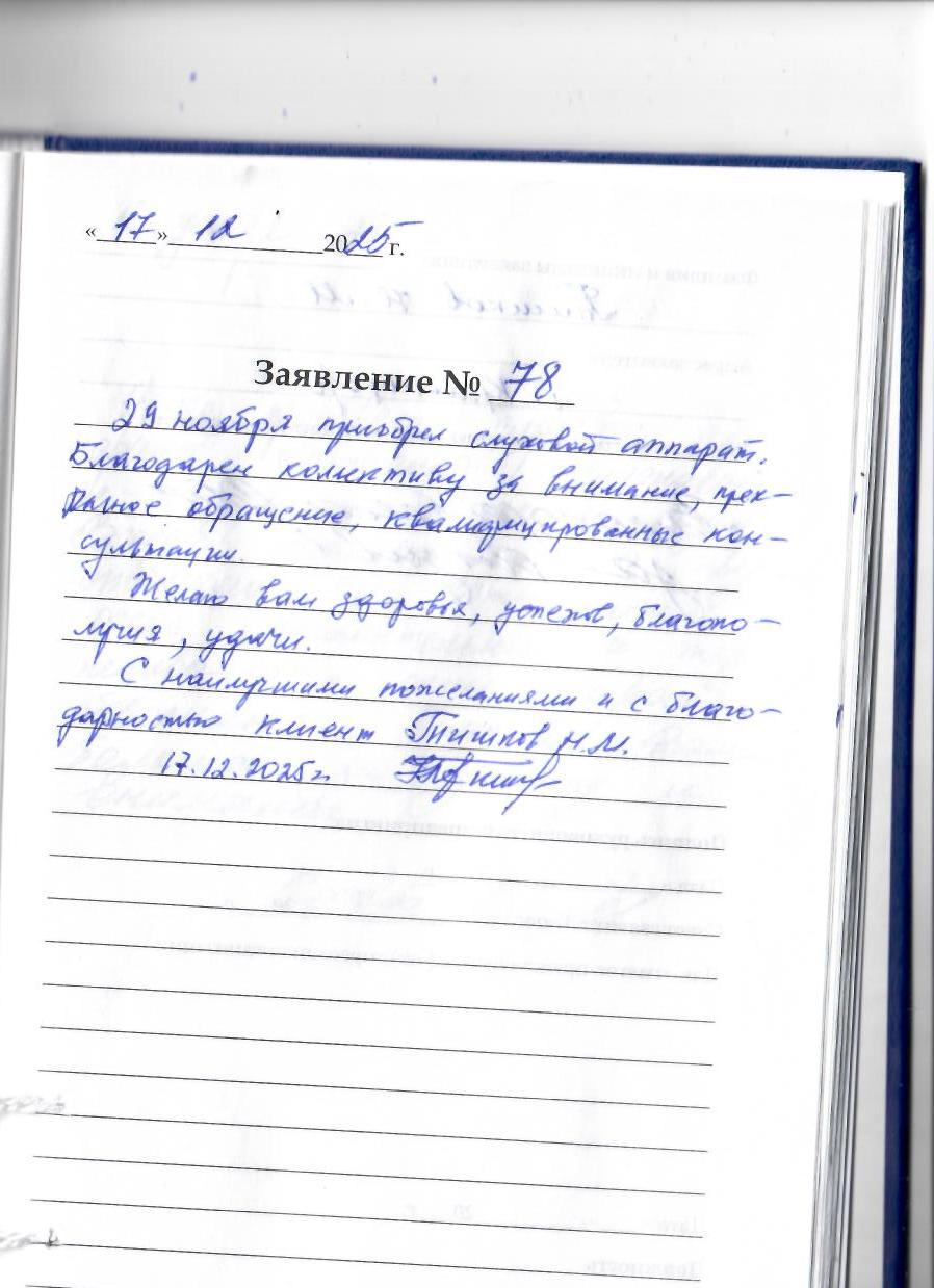 29 ноября приобрел слуховой аппарат. Благодарен коллективу за внимание, прекрасное обслуживание, квалифицированные консультации. Желаю вам здоровья, успехов, благополучия, удачи.