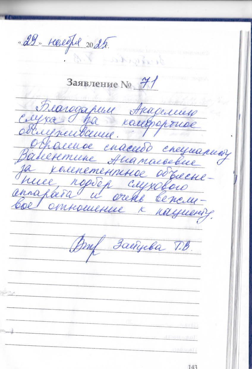 Ранее приобрели слуховые аппараты. Постоянно обслуживаемся в данной Академии слуха. Всегда напоминают о предстоящих ТО. Сотрудники очень внимательны и терпеливы. Всё очень хорошо объясняют. Спасибо Вам большое за заботу и внимание. Сохт З.М.