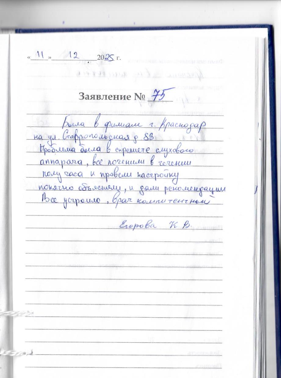 Была в филиале г. Краснодар а ул. Ставропольская, 83. Проблема была в скрежете слухового аппарата, все починили в течении получаса и провели настройку, понятно объяснили и дали рекомендации. Все устроило, врач компетентный. Егорова К.В.