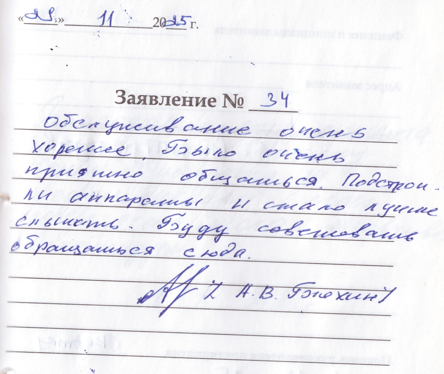 Обслуживание очень хорошее.Было очень приятно общаться. Подстроили аппараты и стало лучше слышать. Буду советовать обращаться сюда.