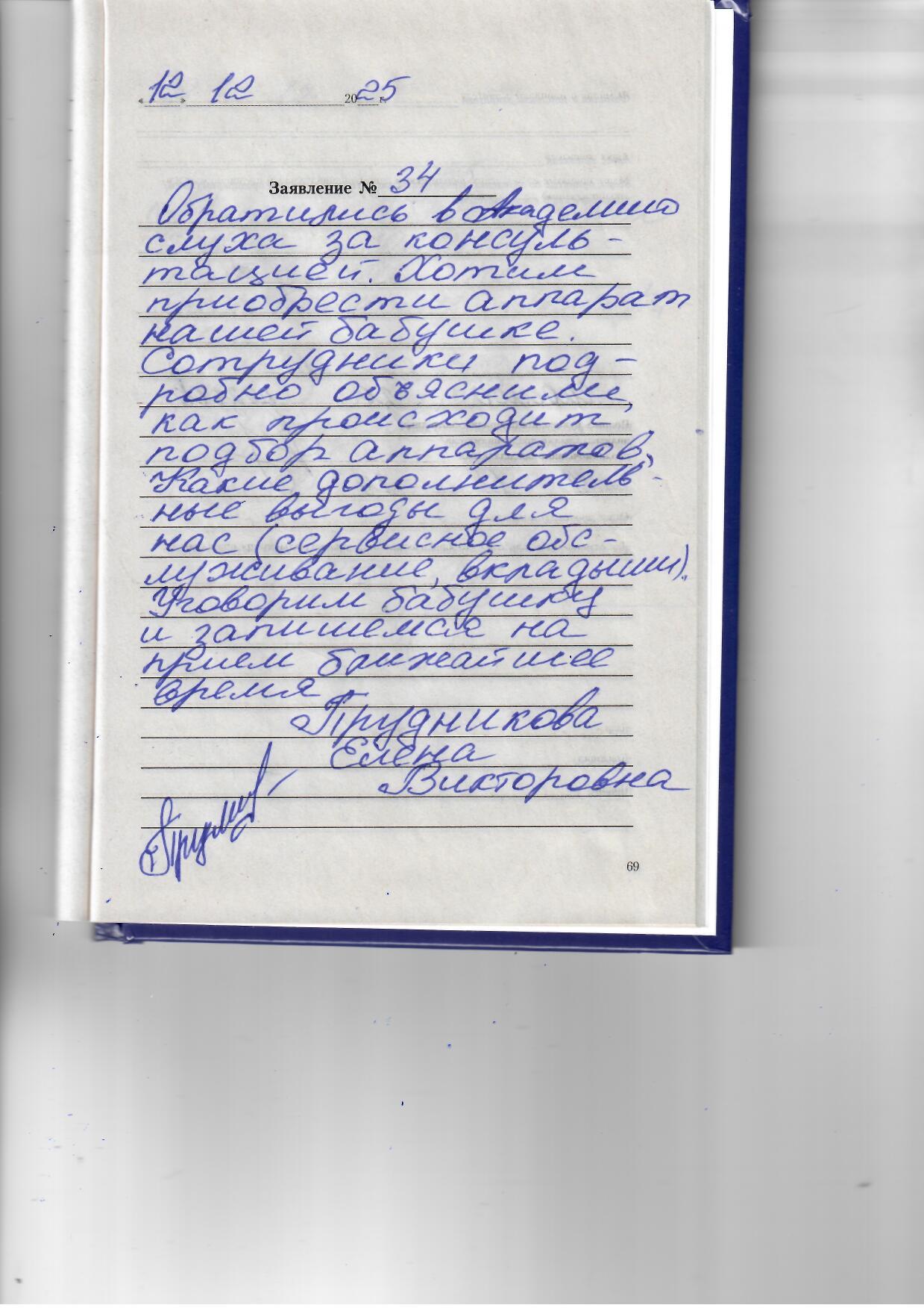 Обратилась в Академию слуха за консультацией. Хотим приобрести аппарат нашей бабушке. Сотрудники подробно объяснилия.как происходит подбор аппаратов. Какие дополнительные выгоды для нас (сервисное обслуживание, вкладыши). Уговорим бабушку и запишемся на прием в ближайшее время.