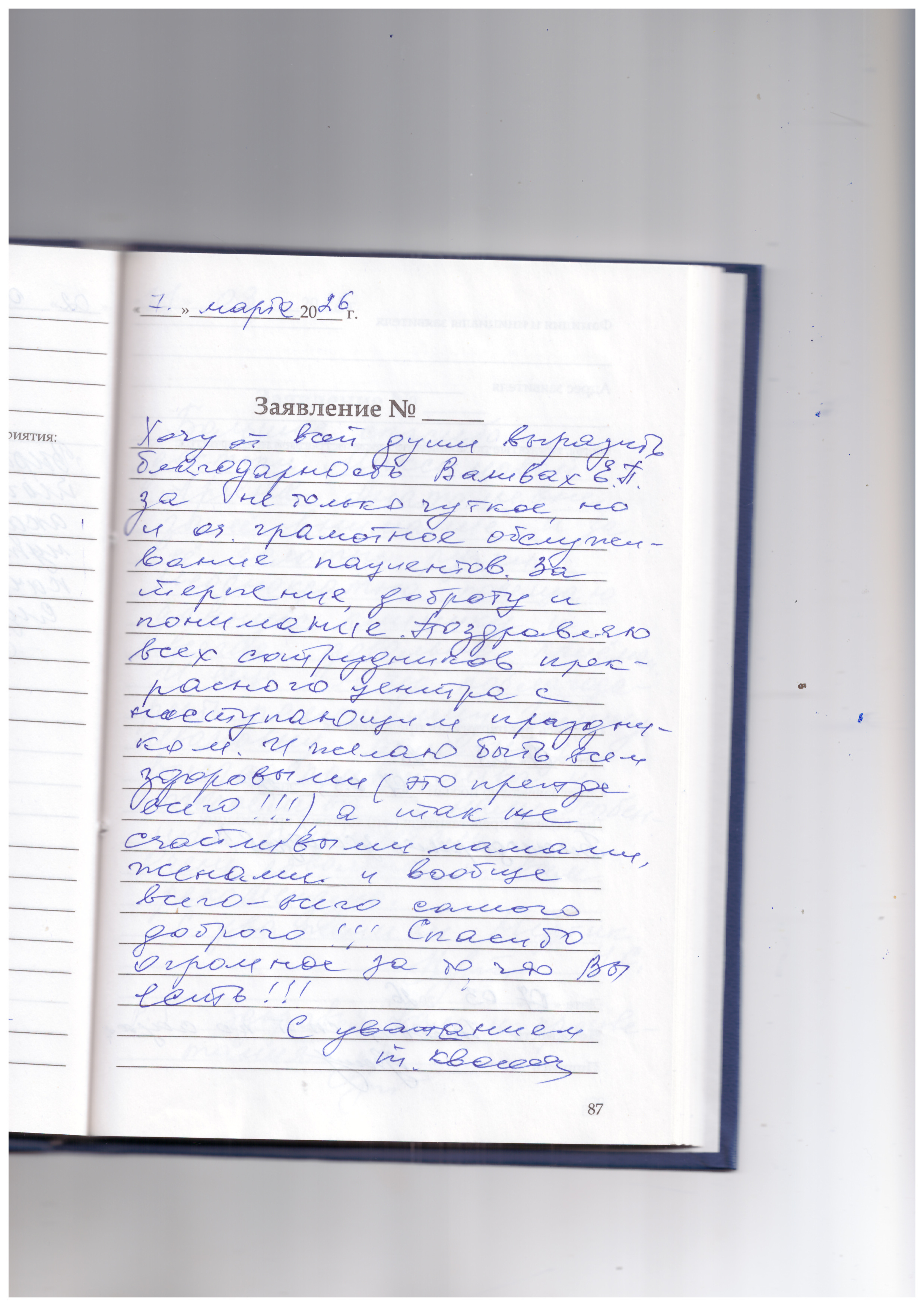 Хочу от всей души выразить благодарность Валивах Е.П. за не только чуткое, но и очень грамотное обслуживание пациентов. За терпение, доброту и понимание. Поздравляю всех сотрудников прекрасного центра с наступающим праздником. И желаю быть всем здоровыми (это прежде всего!!!), а также счастливыми мамами, женами и вообще всего-всего самого доброго!!! Спасибо огромное за то, что Вы есть!!! С уважением, Кваскова.