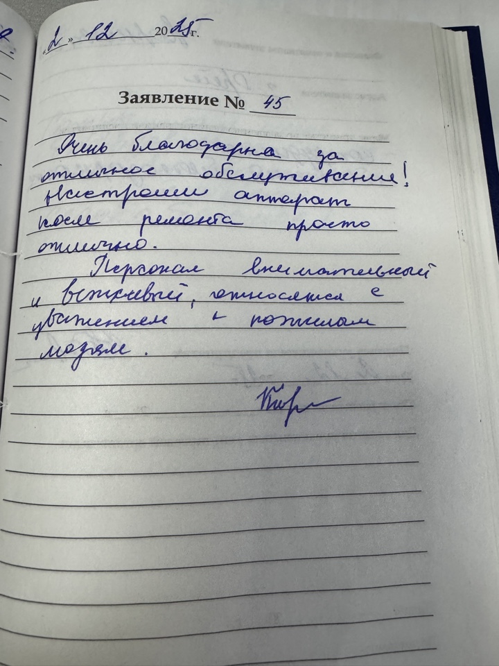 Очень благодарна за отличное обслуживание! Настроили аппарат после ремонта просто отлично. Персонал внимательный и вежливый, относятся с уважением к пожилым людям.