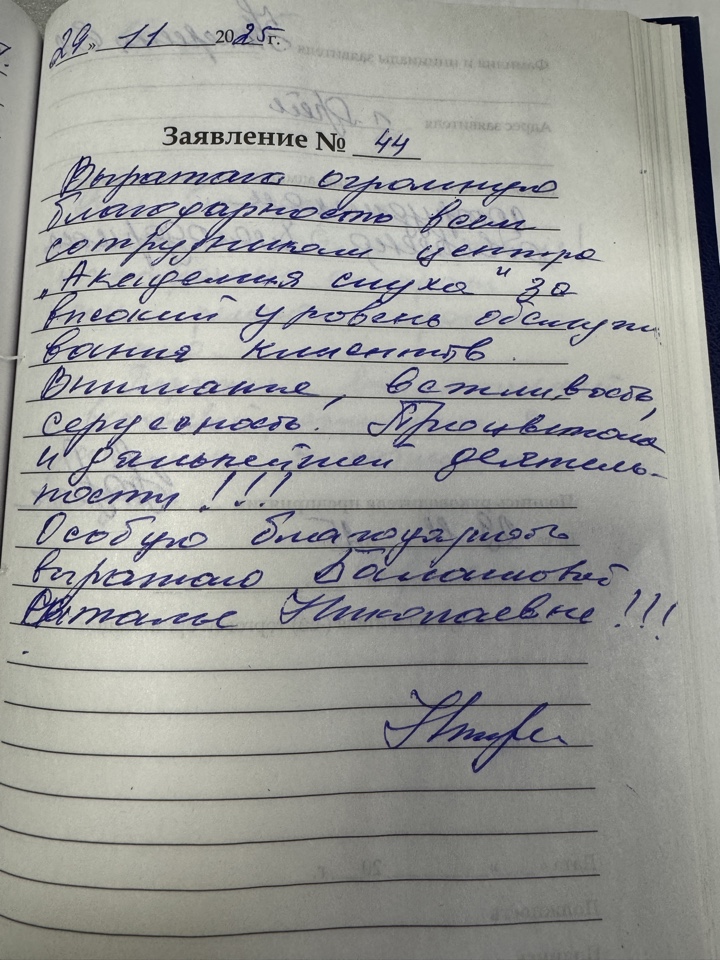 Выражаю огромную благодарность всем сотрудникам центра " Академия слуха" за высокий уровень обслуживания клиентов . Внимание, вежливость, сердечность! Процветания и дальнейшей деятельности!! Особую благодарность выражаю Балашовой Наталии Николаевне!!