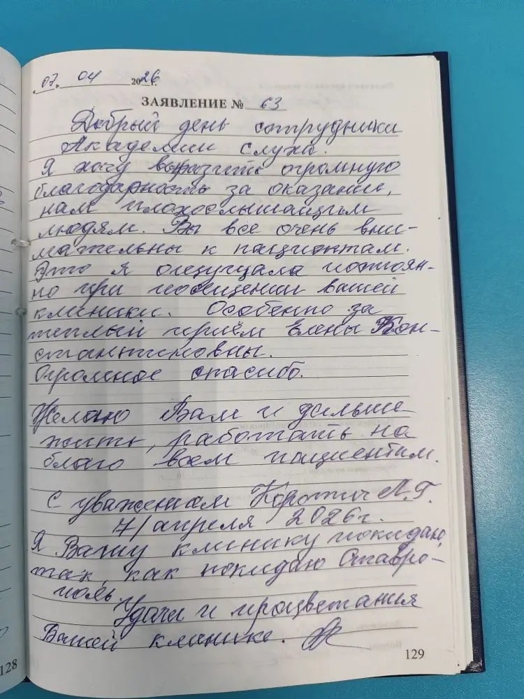 Добрый день сотрудники Академии слуха. Я хочу выразить огромную благодарность за оказание нам плохо слышащим людям. Вы все очень внимательны к пациентам. Это я ощущала постоянно при посещении вашей клиники. Особенно за теплый прием Елены Константиновны. Огромное спасибо. Желаю Вам и дальше жить, работать на благо всем пациентам. С уважением Коротич Л.Г. 7 апреля 2026 г. Я Вашу клинику покидаю так, как покидаю Ставрополь. Удачи и процветания Вашей клинике. подпись