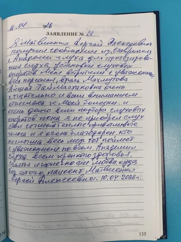Я, Матвиенко Сергей Алексеевич получил сообщение из Ставрополя с академии слуха для протезирования слуха установки слуховых аппаратов. Меня встретили с уважением весь персонал, врач Махмутова Айшат Таймасхановна очень тщательно и всем вниманием отнеслась к моей болезни и очень долго вели подборы слуховых аппаратов пока я не приобрел слух стал слышать теплые приветливые голоса и я очень благодарен. Кто не слыша весь мир тот поймет С уважением ко всем академии слуха. всем крепкого здоровья, счастья и конечно же любви, куда без этого. пациент Матвиенко Сергей Алексеевич. 10.04.2026