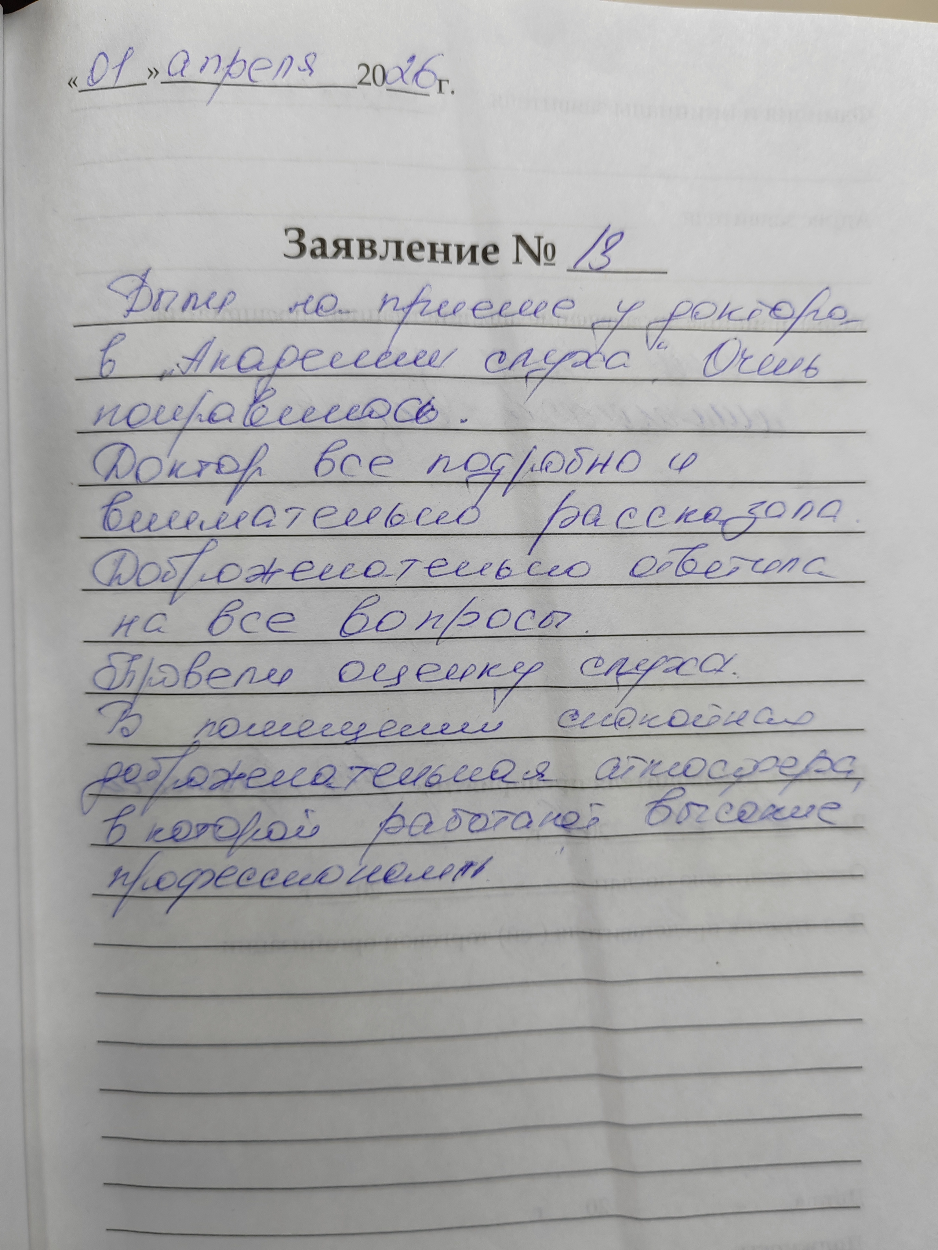 Были на приеме у доктора в Академии слуха. Очень понравилось! Доктор все подробно и внимательно рассказала. Доброжелательно ответила на все вопросы. Провели оценку слуха. В помещении спокойная и доброжелательная атмосфера, в которой работают высокие профессионалы.