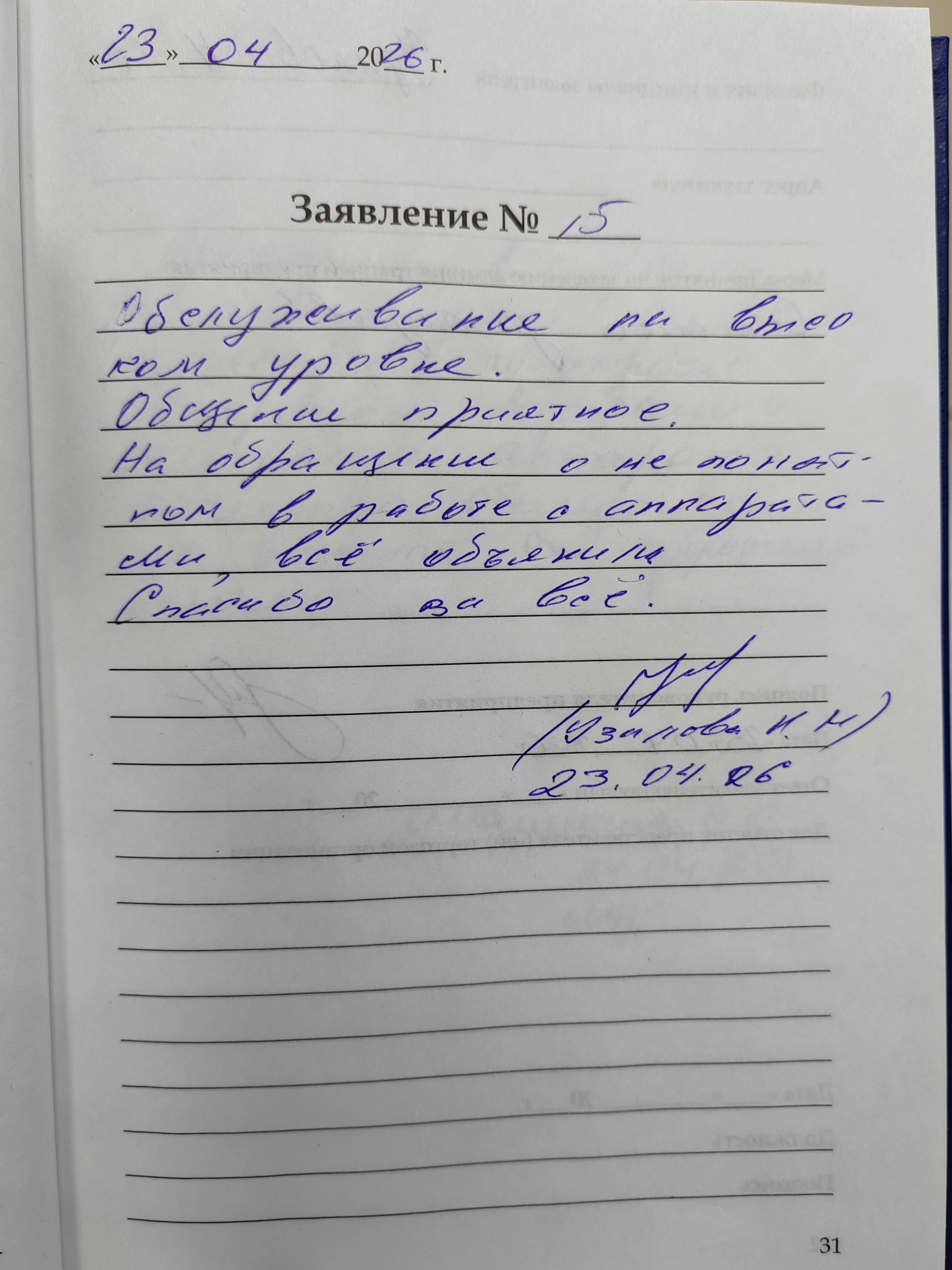 Обслуживание на высоком уровне. Общение приятное. На обращение о не понятном в работе с аппаратами все объяснили. Спасибо за все!