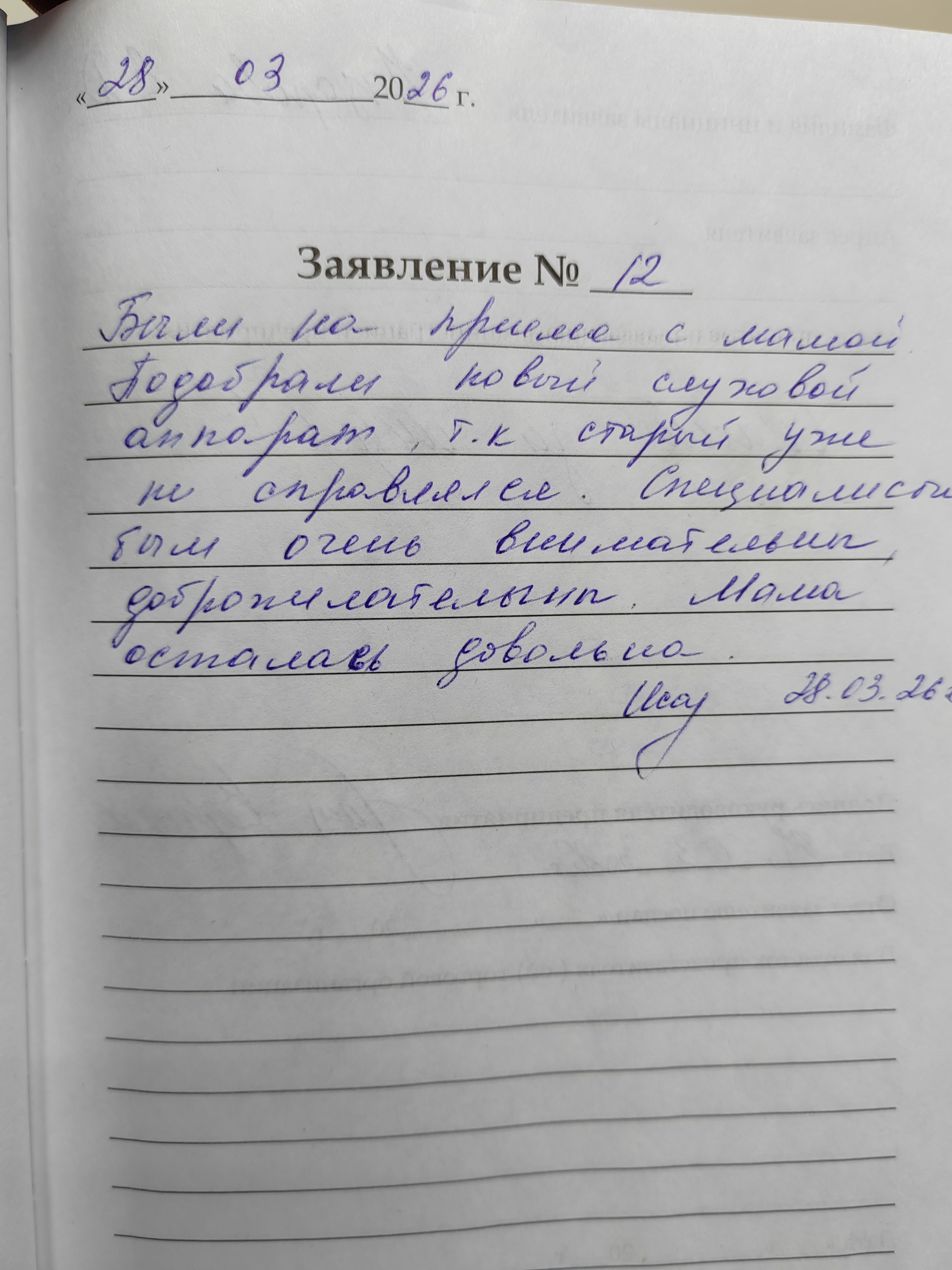 Приходила с ребенком за аппаратами. Очень приветливо и хорошо встретили. Подобрали и настроили аппараты. Качество обслуживания на высоте. Все доброжелательные.