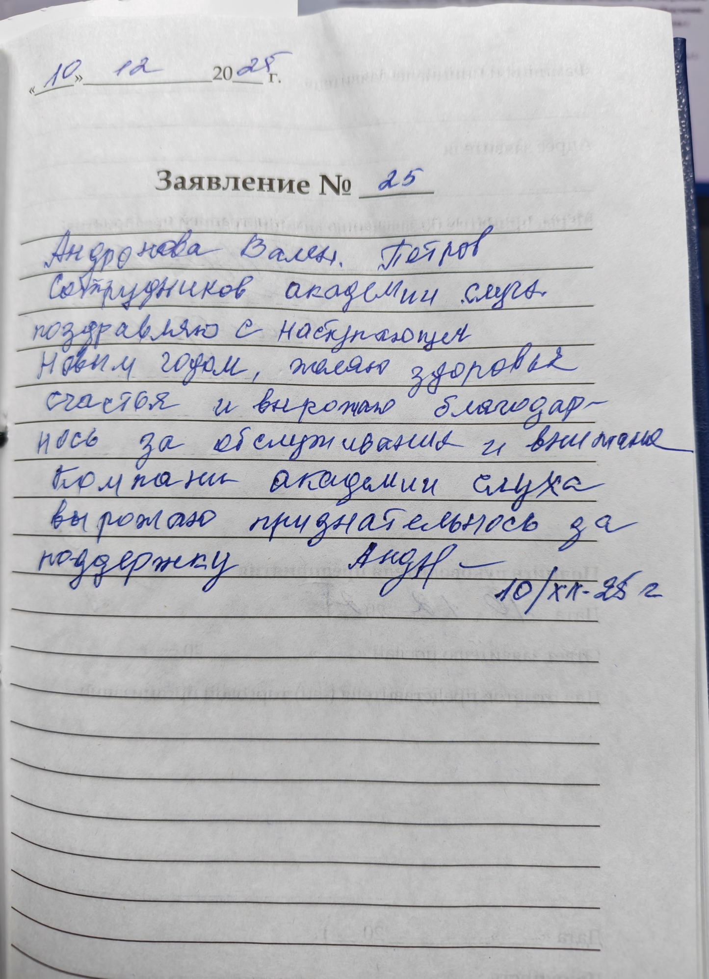 Андронова Валентина Петровна Сотрудников Академии Слуха поздравляю с Наступающим Новым Годом, желаю счастья, здоровья и выражаю благодарность за обслуживание и внимание. Компании Академии Слуха выражаю признательность за поддержку. 10.12.2025