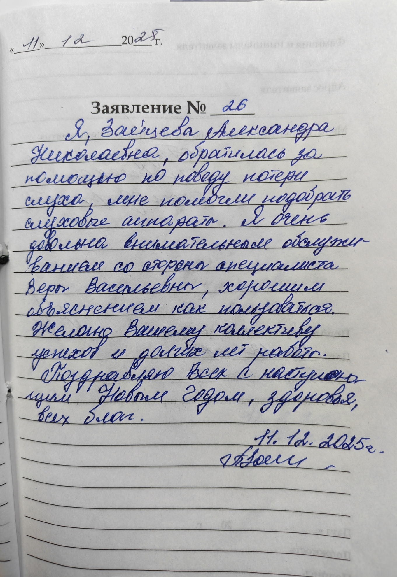 Я, Зайцева Александра Николаевна, обратилась за помощью по поводу потери слуха, мне помогли подобрать слуховые аппараты. Я очень довольна внимательным обслуживанием со стороны специалиста Веры Васильевны, хорошим объяснение как пользоваться. Желаю Вашему коллективу успехов и долгих лет работы. Поздравляю Всех с наступающим Новым Годом, здоровья, всех благ. 11.12.2025
