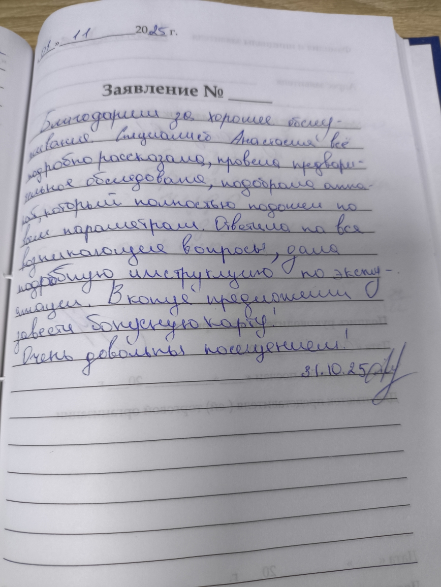 Благодарим за хорошее обслуживание. Специалист Анастасия все подробно рассказала, провела предварительное обследование, подобрала аппарат , который полностью подошел по всем параметрам. Ответила на все возникающие вопросы, дала подробную инструкцию по эксплуатации. В конце предложили завести бонусную карту.