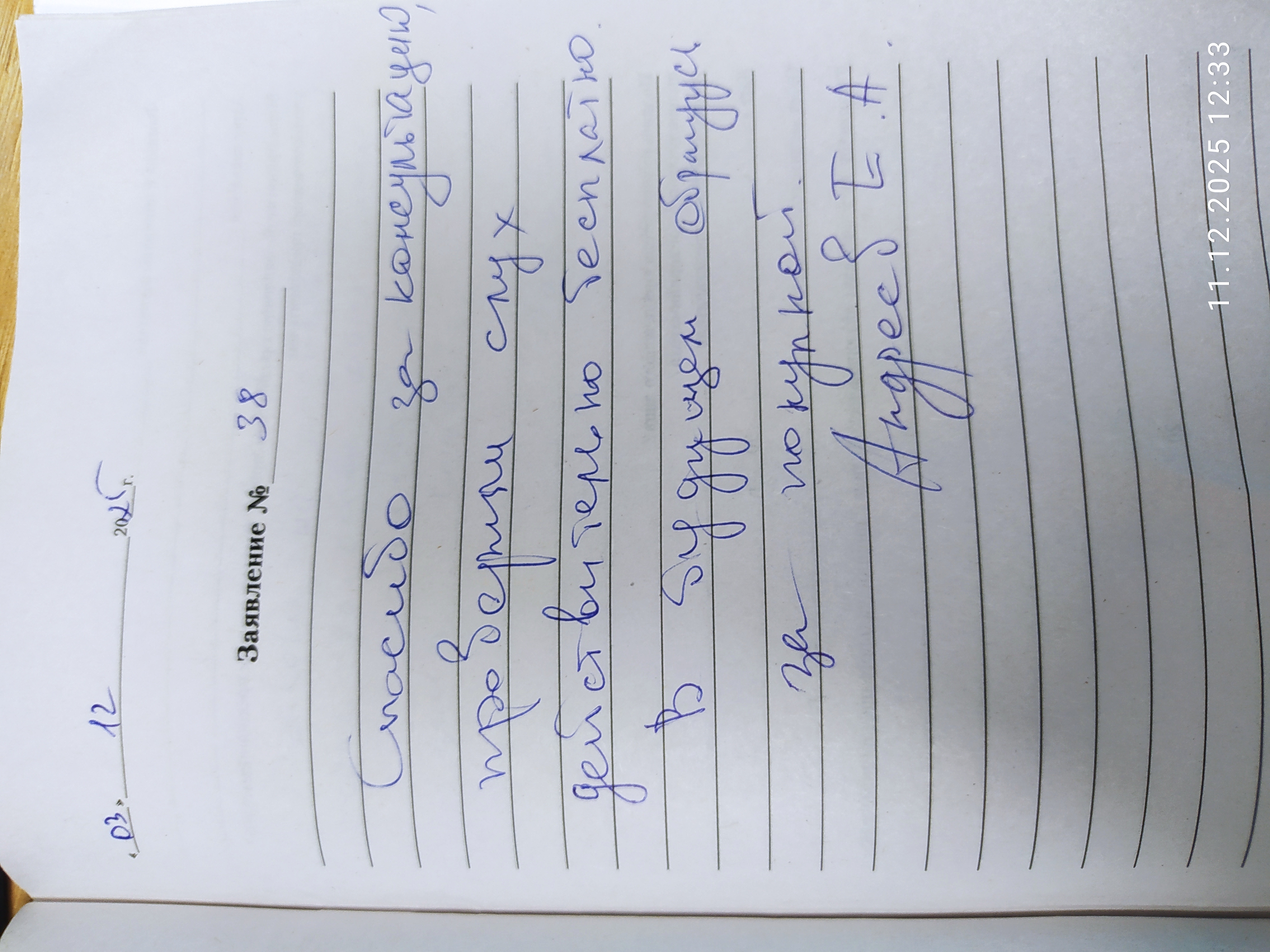 Спасибо за работу, за ваш труд. Приятное общение, внимательность, подбор слухового аппарата. Благодарю!