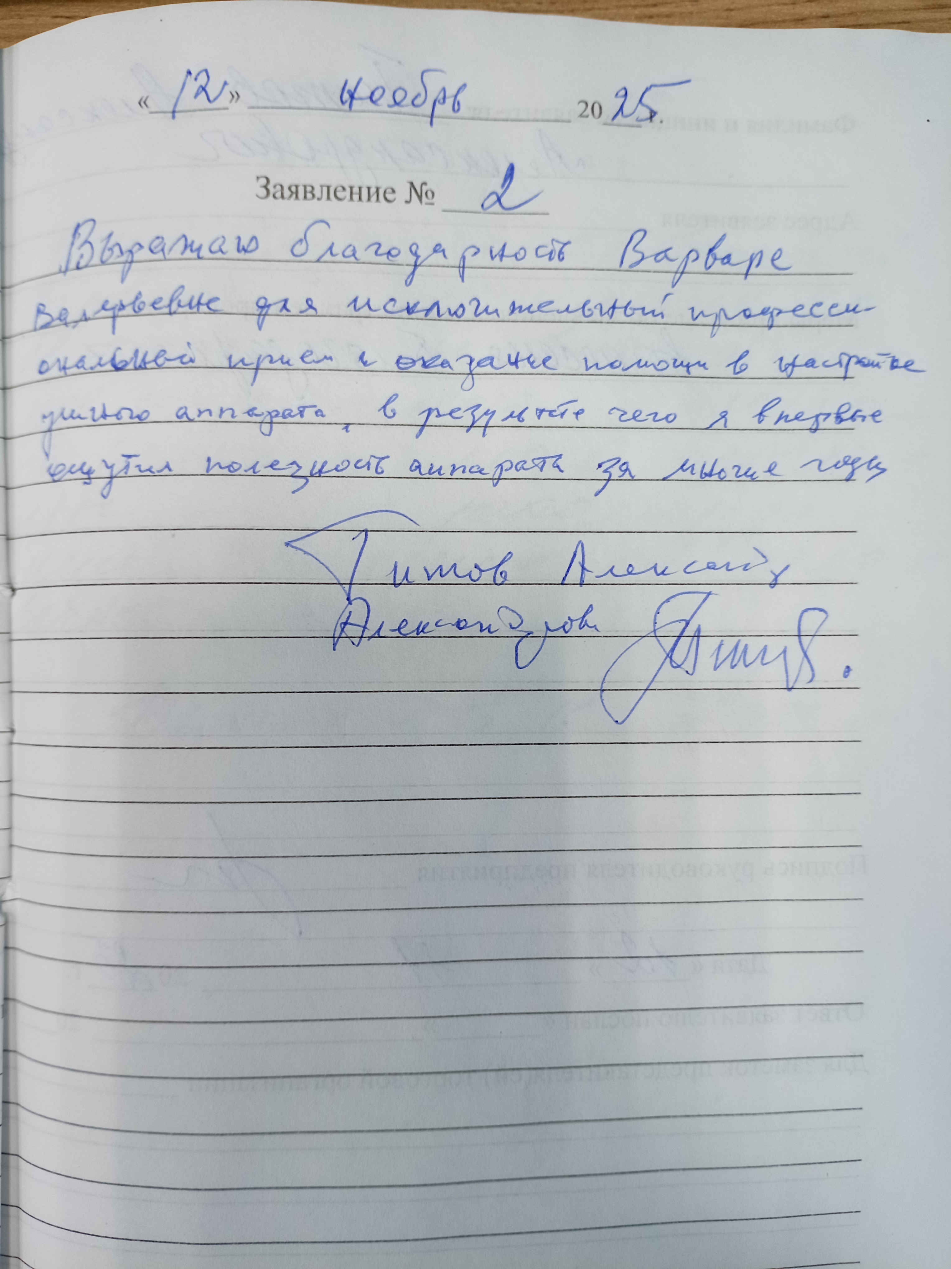 Выражаю благодарность за исключительно профессиональный прием и оказание помощи в настройке аппарата, в результате чего я впервые ощутил полезность аппарата за многие годы.
