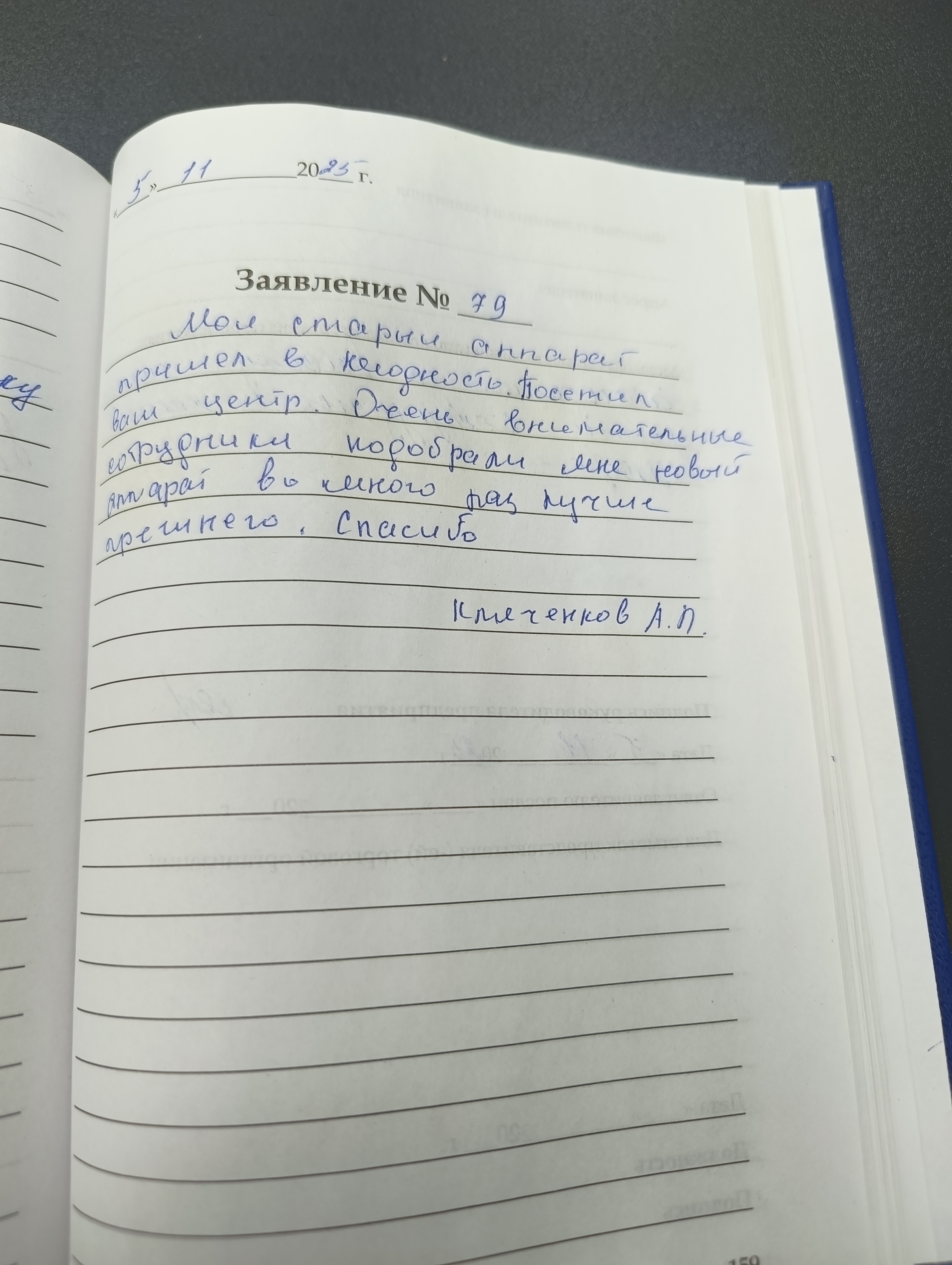 Мой старый аппарат пришел в негоднось. Посетил ваш центр. Очень внимательные сотрудники подобрали мне новый аппарат во мого раз лучше прежнего.Спасибо