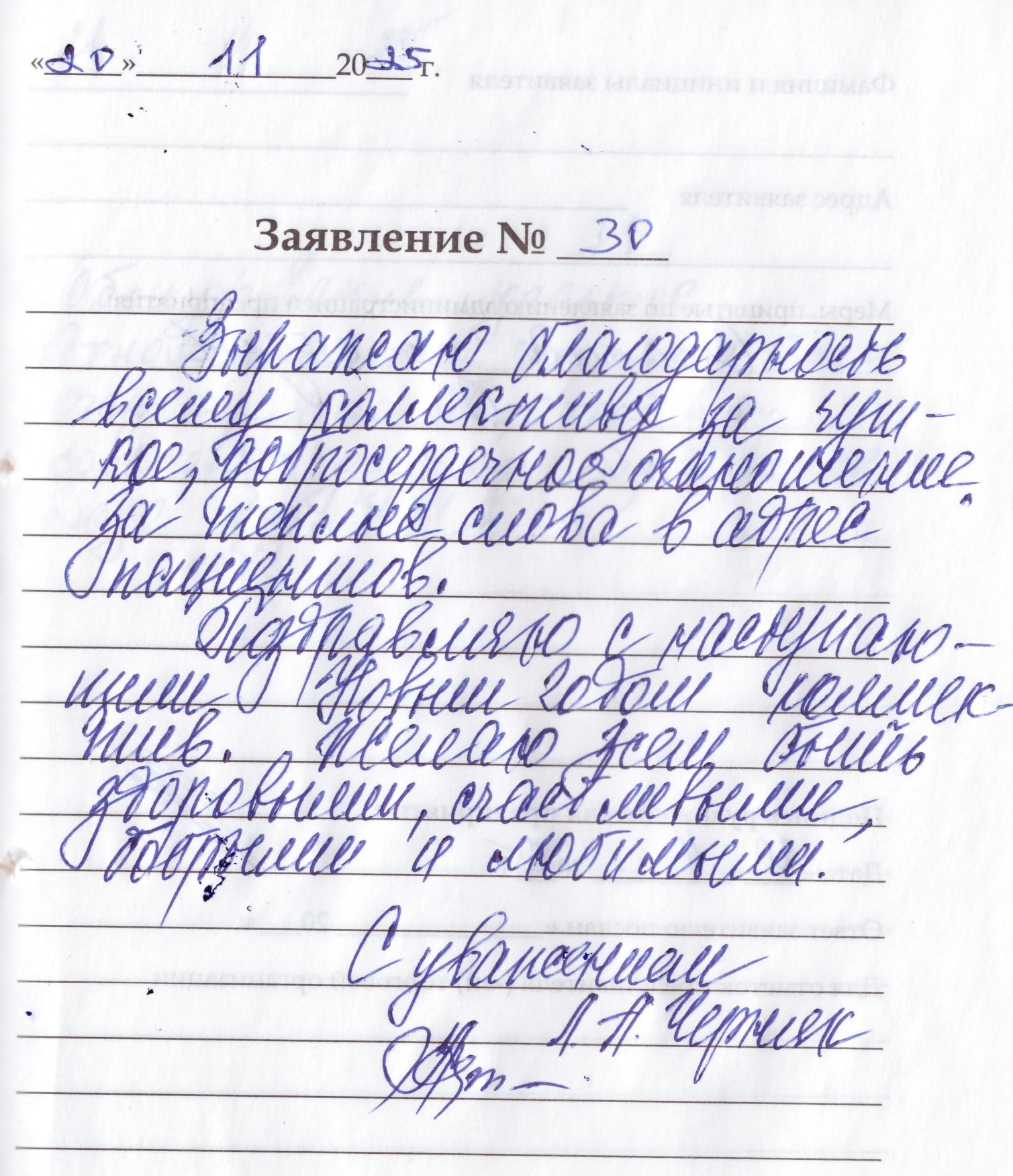 Выражаю благодарность всему коллективу за чуткое, добросердечное отношение, за теплые слова в адрес пациентов. Поздравляю с наступающим Новым годом коллектив. Желаю всем быть здоровыми, счастливыми, добрыми и любимыми. С уважением.