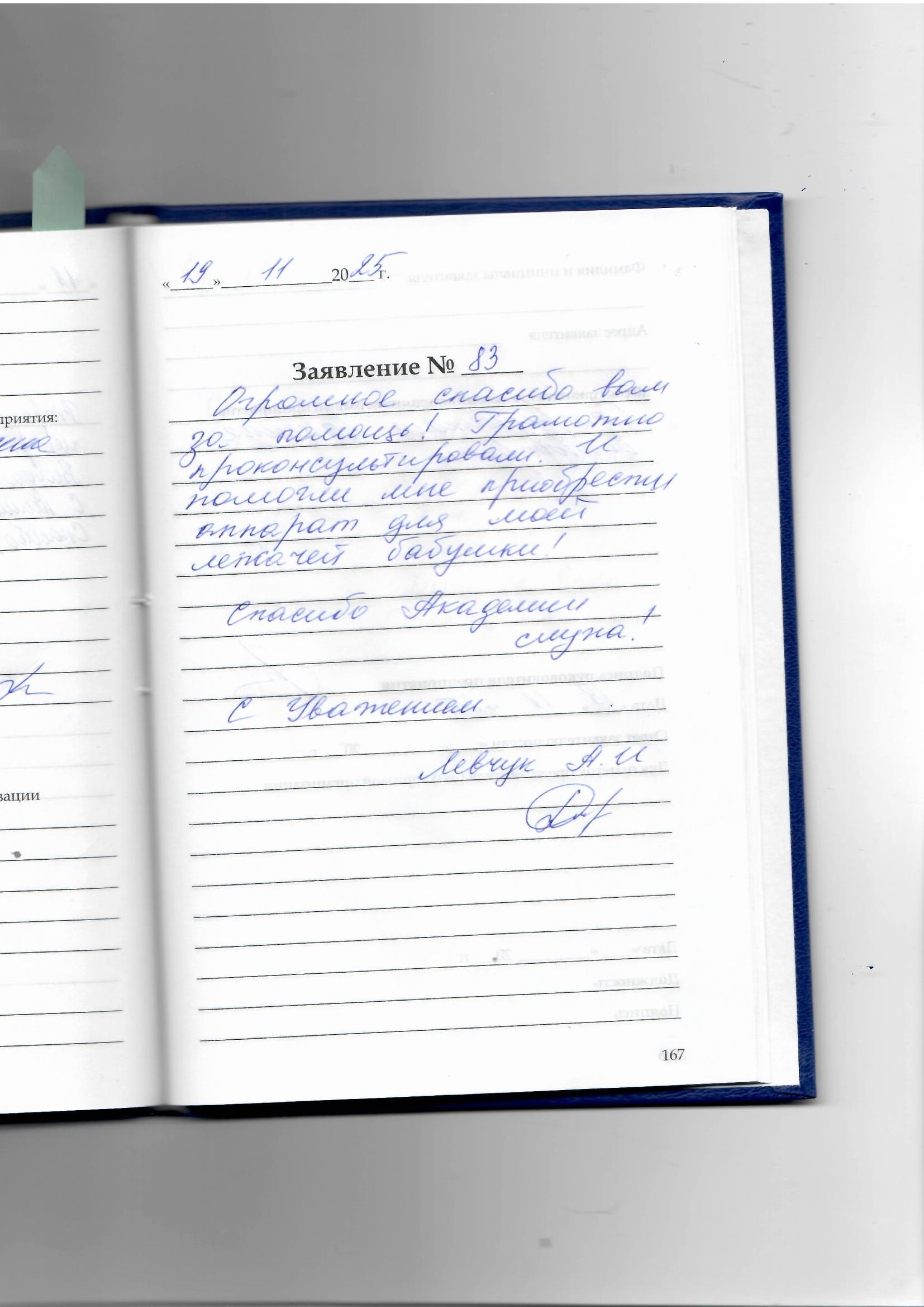 Выражаю благодарность за исключительно профессиональный прием и оказание помощи в настройке аппарата, в результате чего я впервые ощутил полезность аппарата за многие годы.