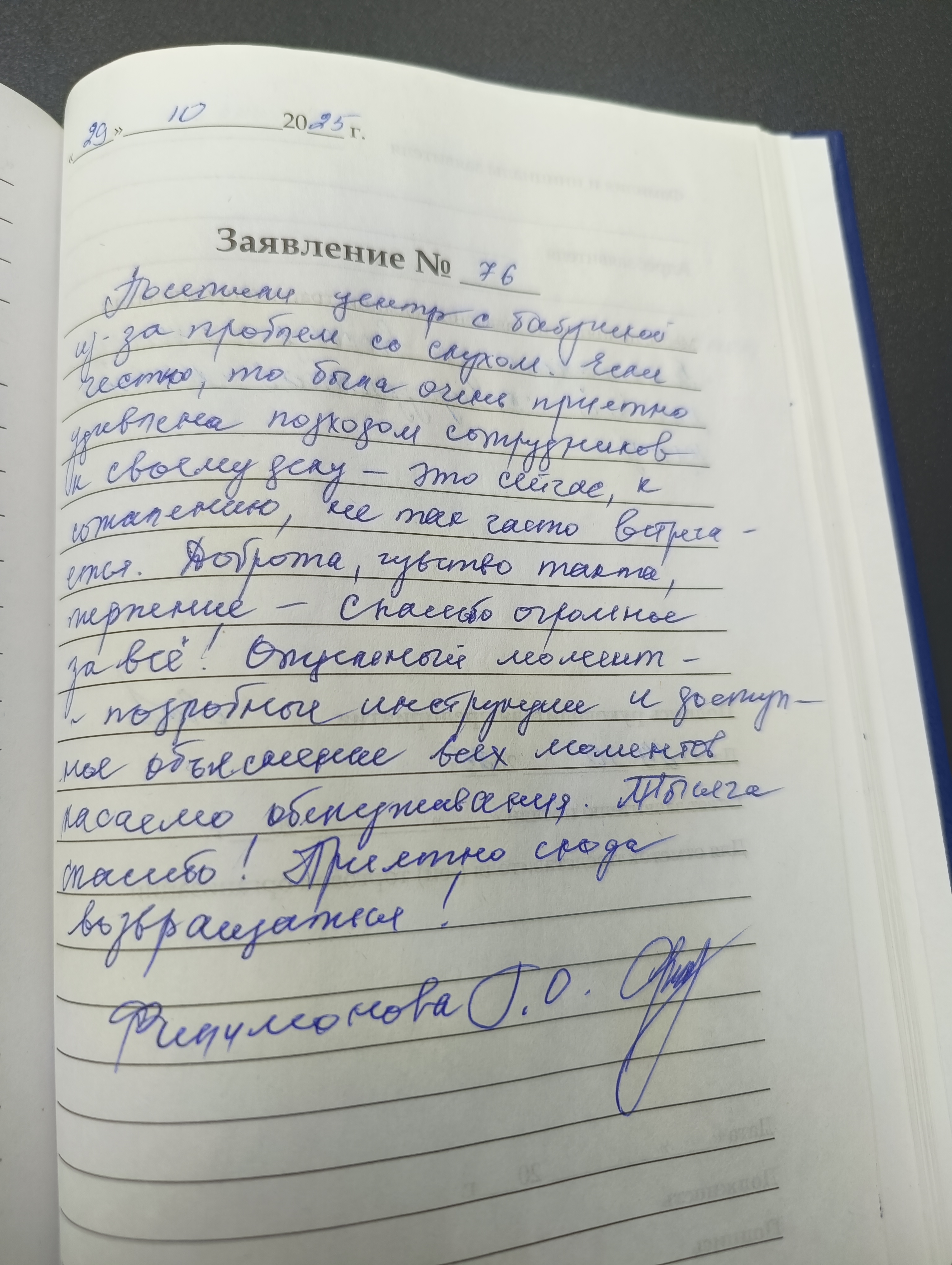 Посетили центр с бабушкой из-за проблем со слухом.Если честно, то была очень приятно удивлена подходом сотрудников к своему делу- это сейчас к сожалению, не так часто встречается. Доброта,чувство такта,терпение-спасибо огромное за все!Отдельный момент-подробные инструкции и доступное объяснение всех моментов касаемо обслуживания. Тысяча спасибо! Приятно сюда возвращаться!