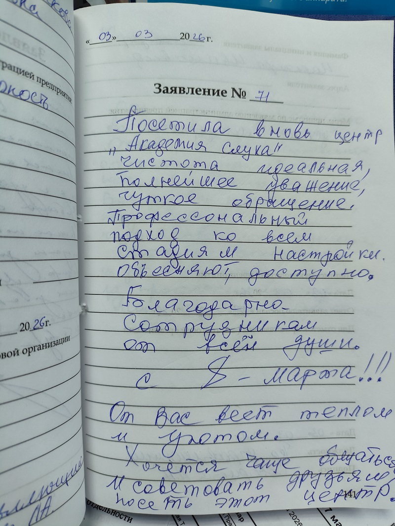 Посетила вновь центр Академии слуха. Чистота идеальная, полнейшее уважение, чуткое обращение. Профессиональный подход ко всем стадиям настройки. Объясняют доступно.Благодарна сотрудникам от всей души! С 8 Марта!!! От вас веет теплом и уютом . Хочется еще общаться и советовать друзьям посетить этот центр!
