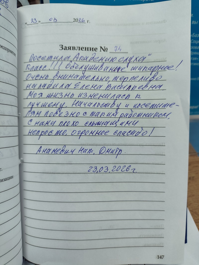 Посетила Академию слуха ! Класс!!! Обслуживание шикарное! Очень внимательно, терпеливо наладила Елена Васильевна. Моя жизнь изменилась к лучшему. Начальству и посетителям повезло с таким работником. С нами плохо слышащими непросто, огромное спасибо!