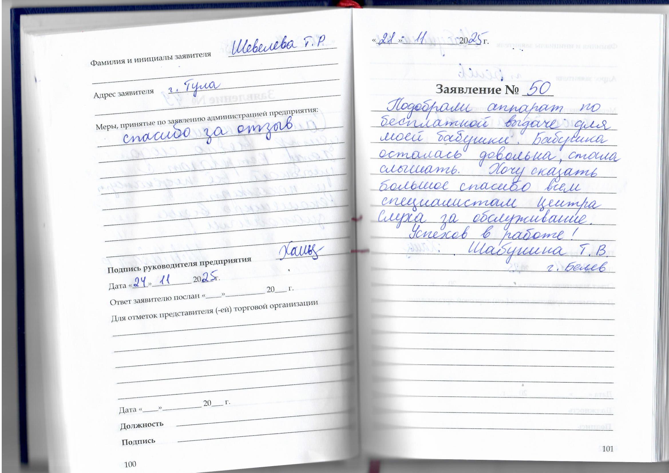 Подобрали аппарат по бесплатной выдаче для моей бабушки. Бабушка осталась довольна, стала слышать. Хочу сказать большое спасибо всем специалистам Центра Слуха за обслуживание. Успехов в работе! Шабунина Т.В. г. Белев