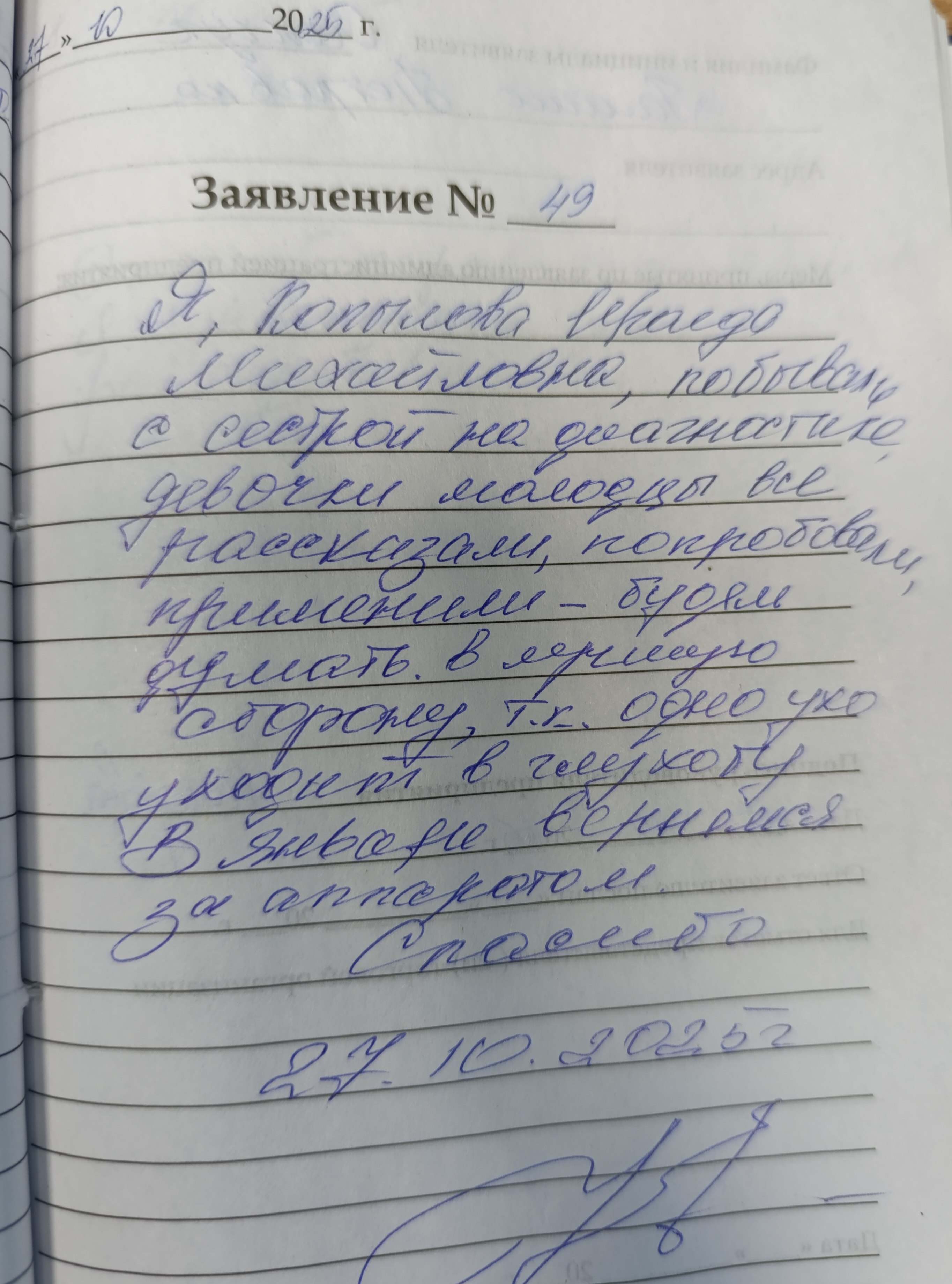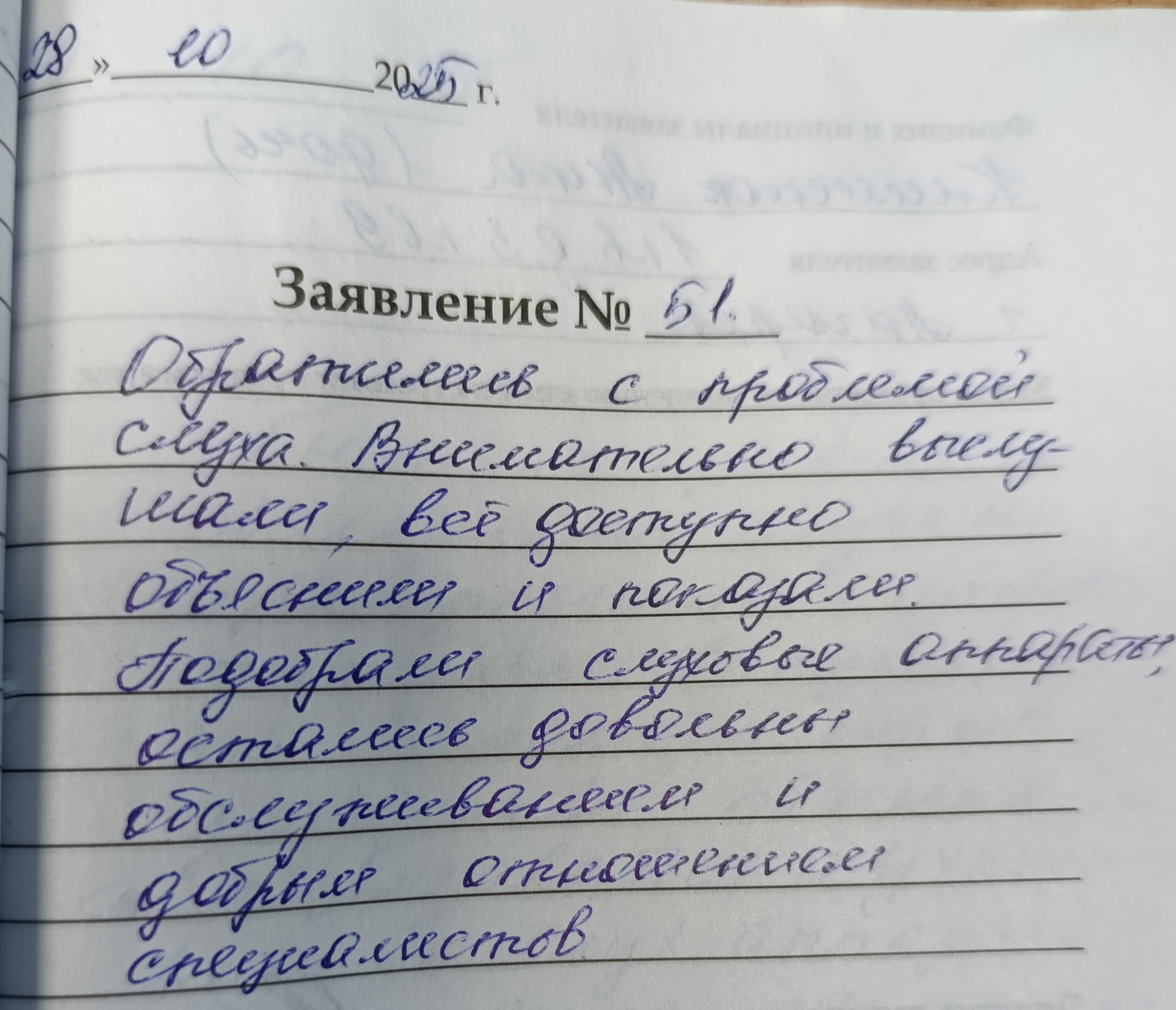 Я, Копылова Ираида Михайловна, побывала с сестрой на диагностике, девочки молодцы все рассказали, попробовали,применили - будем думать в лучшую сторону, т.к. одно ухо уходит в глухоту. В январе вернемся за аппаратом. Спасибо.
