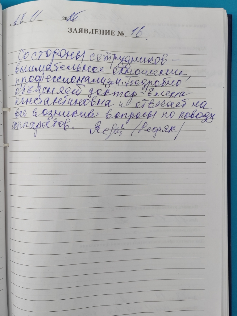 Со стороны сотрудников- внимательное отношение, профессионализм. подробно объясняет доктор Елена Константиновна и отвечает на все возникшие вопросы по поводу аппаратов. Рефяк