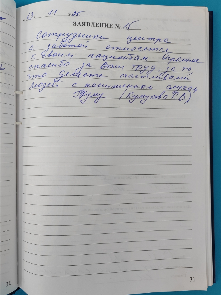 Сотрудники центра с заботой относятся к своим пациентам. огромное спасибо за ваш труд. за то, что делаете счастливыми людей с пониженным слухом. Кумукова Г.В.