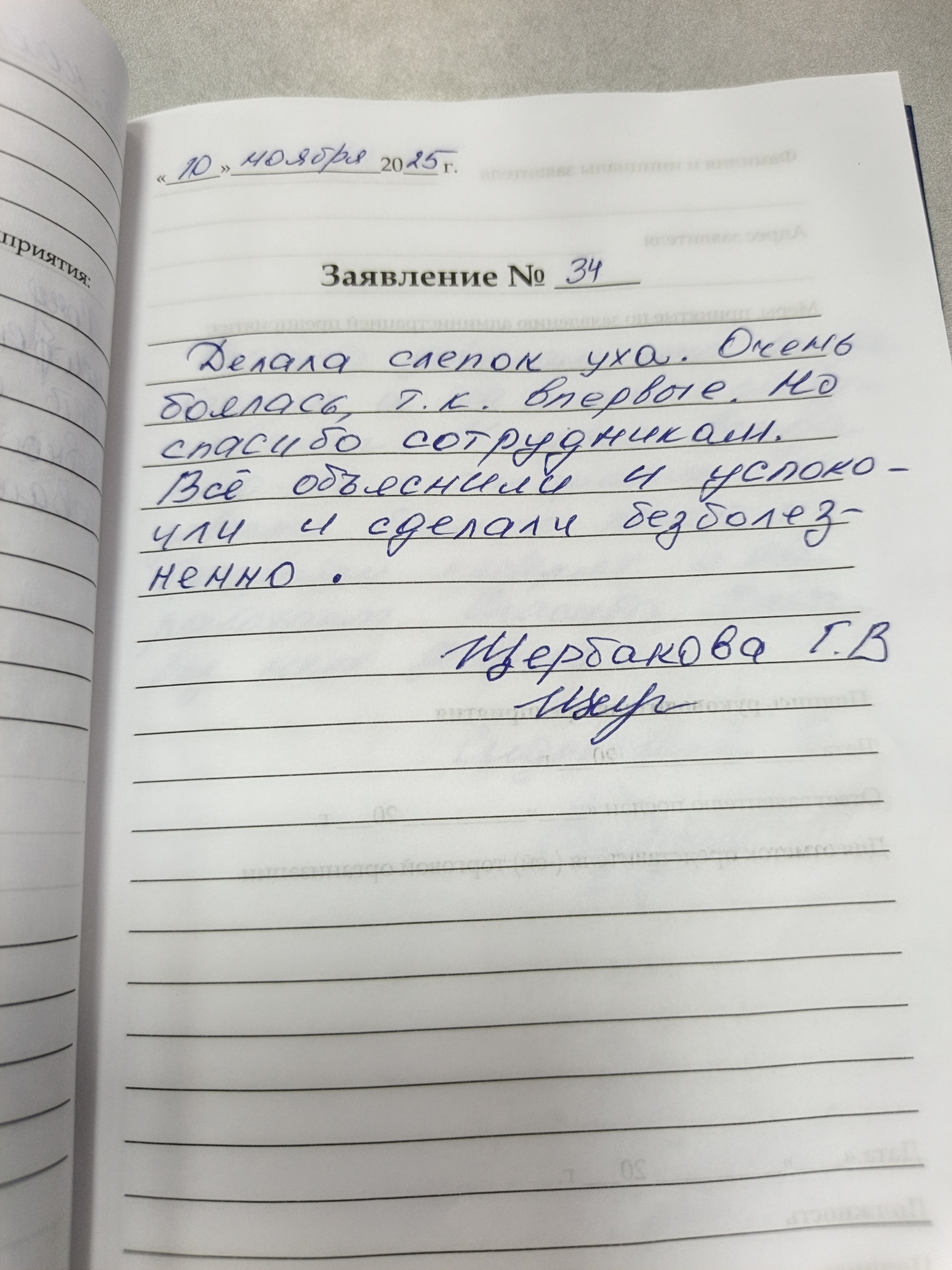 Делала слепок уха. Очень боялась, т.к. впервые. Но, спасибо сотрудникам. Все объяснили и успокоили и сделали все безболезненно.