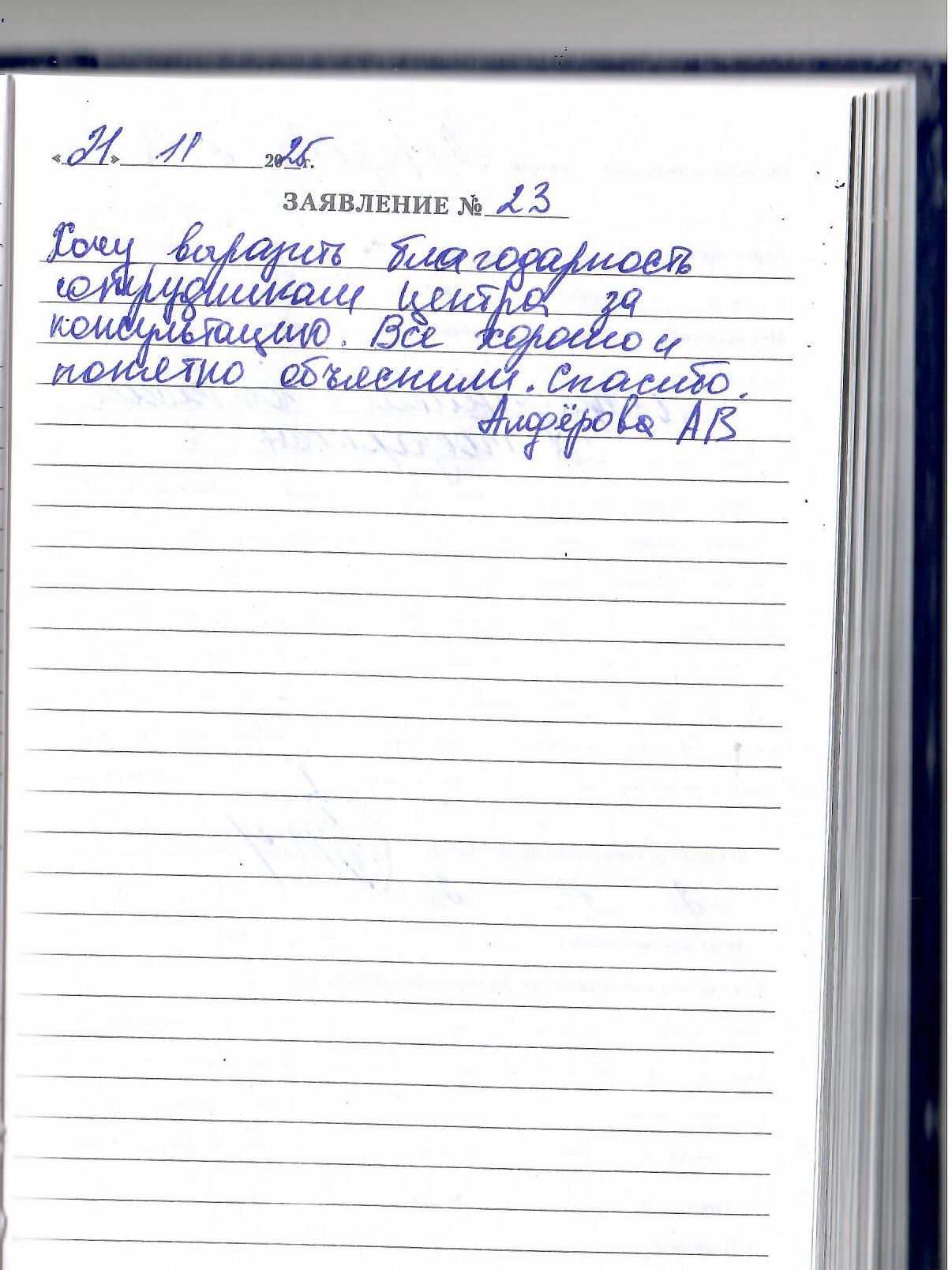 Хочу выразить благодарность сотрудникам центра за консультацию. Все хорошо и понятно объяснили. Спасибо.