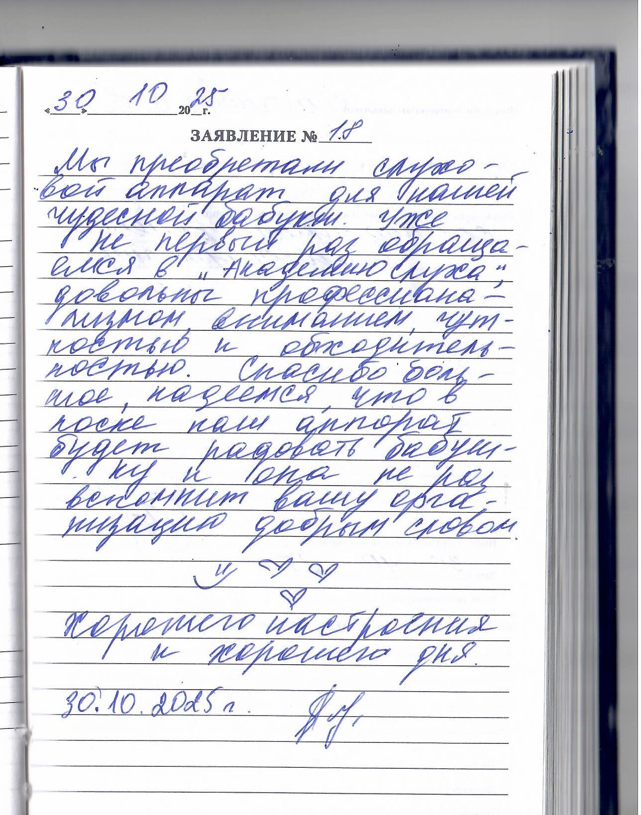 Мы приобретали слуховой аппарат для нашей чудесной бабушки. Уже не первый раз обращаемся в «Академию слуха», довольны профессионализмом, вниманием, чуткостью и обходительностью. Спасибо большое, надеемся, что в носке наш аппарат будет радовать бабушку и она не раз вспомнит вашу организацию добрым словом. Хорошего настроения и хорошего дня.