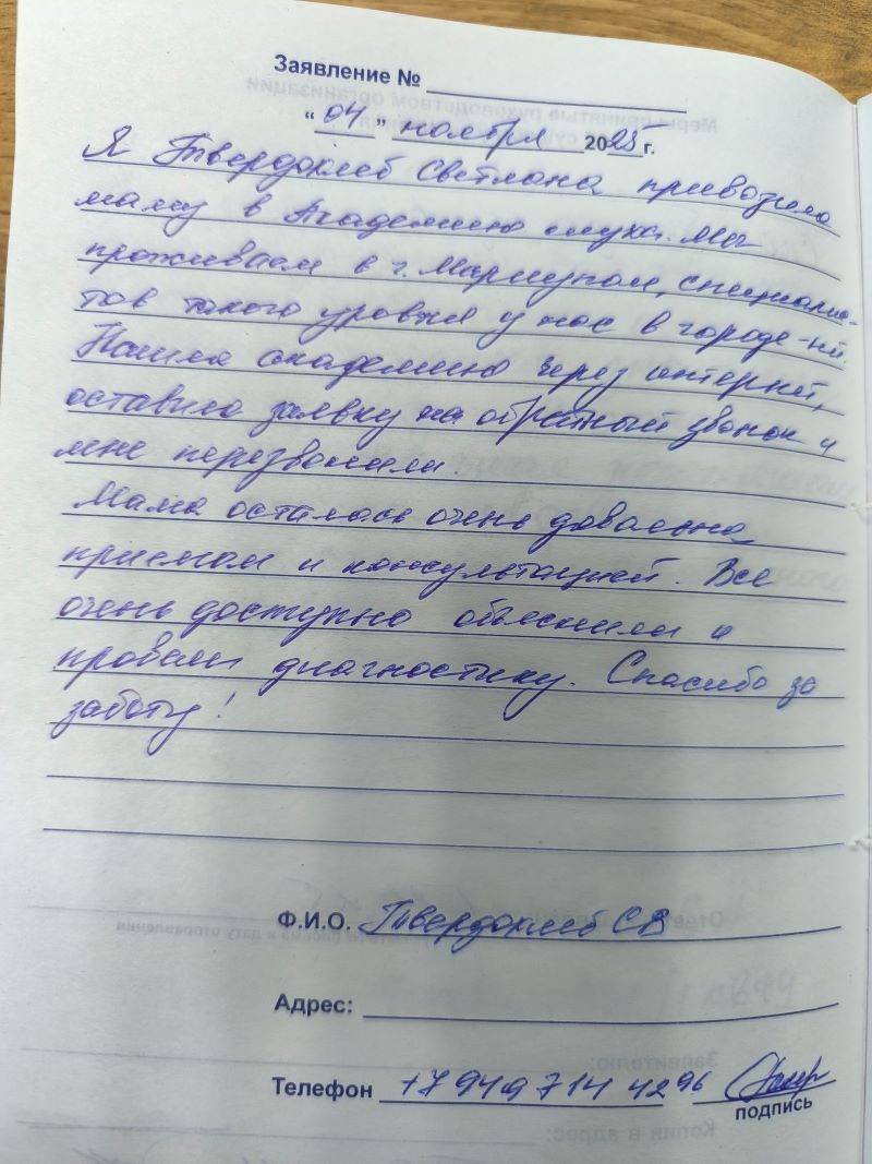 Я, Твердохлеб Светлана приводила маму в Академию слуха. Мы проживаем в г. Мариуполе, специалистов такого уровня у нас в городе- нет. Нашла Академию через интернет, оставила заявку на обратный звонок и мне перезвонили.