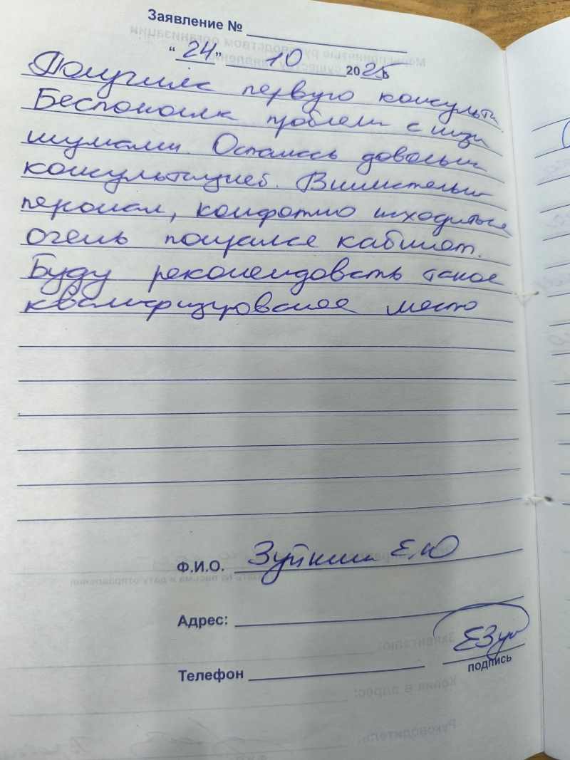 Получил первую консультацию. Беспокоила проблема с шумами. Остались довольны консультацией. Внимательный персонал, комфортно находиться очень, понравился кабинет. Буду рекомендовать такое квалифицированное место.