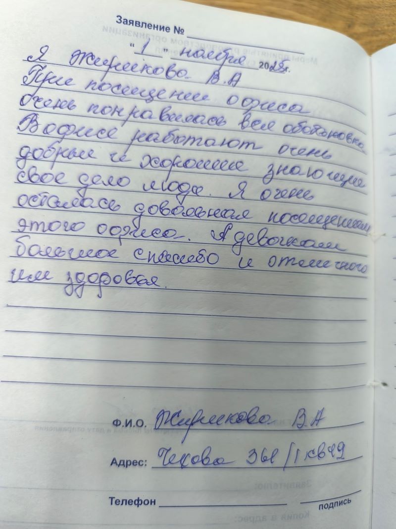 Я Жирикова В.А. при посещении офиса очень понравилось вся обстановка. В офисе работают очень добрые и хорошие знающие своё дело люди. Я очень осталась довольная посещением этого офиса. А девочкам большое спасибо и отличного им здоровья.