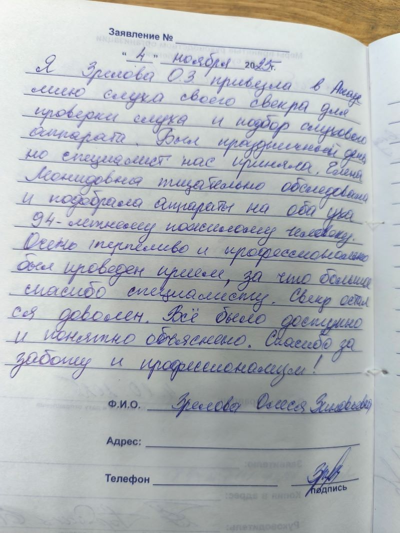 Я Зрелова О.З. привезла в Академию слуха своего свёкра для проверки слуха и подбор слухового аппарата. Был праздничный день, но специалист нас приняла. Елена Леонидовна тщательно обследовала и подобрала аппараты на оба уха 94-летнему пожилому человеку. Очень терпеливо и профессионально был проведён приём, за что большое спасибо специалисту. Свёкр остался доволен. Всё было доступно и понятно объяснено. Спасибо за заботу и профессионализм!