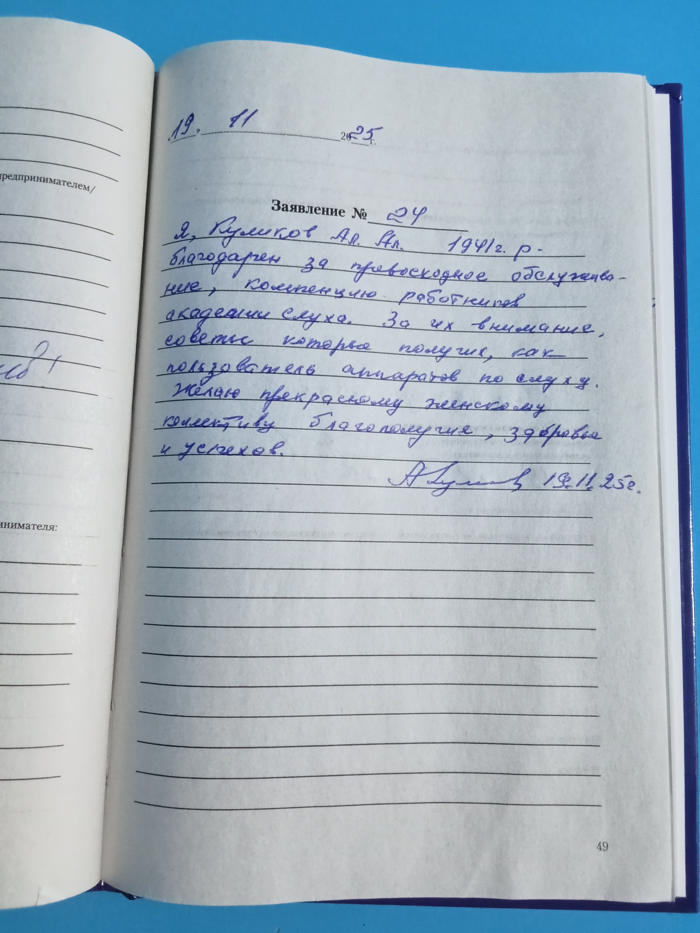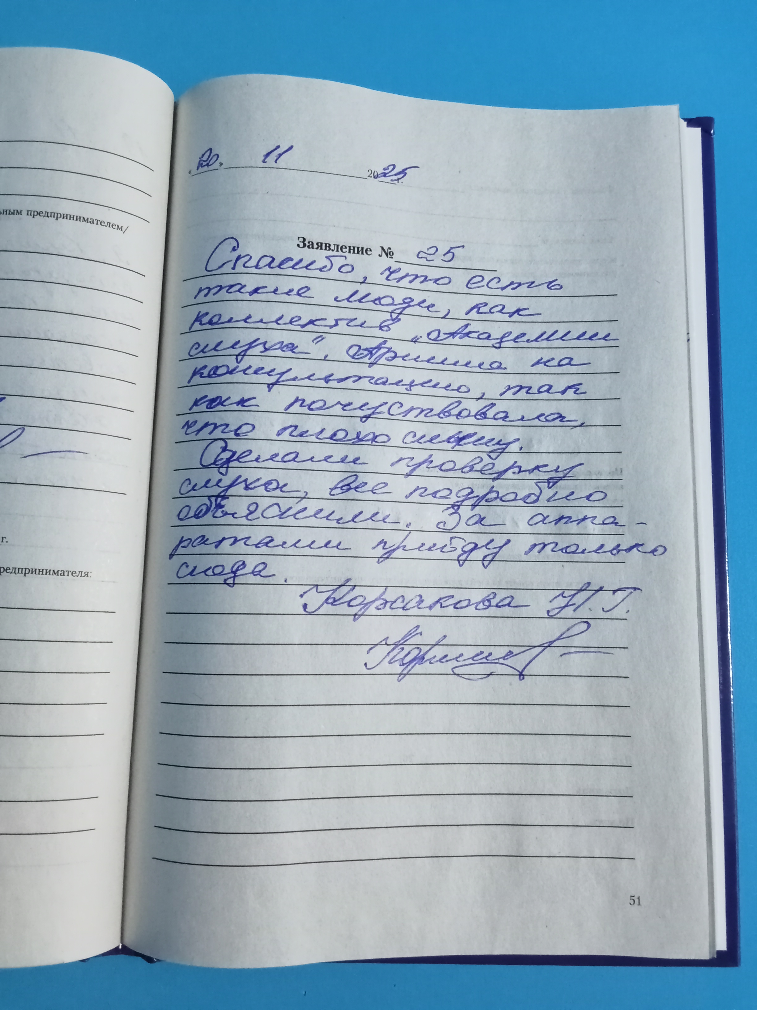 Я, Куликов А.А 1941 г.р благодарен за превосходное обслуживание ,компетенцию работников академии слуха.За их внимание, советы которые получил, как пользователь аппаратов по слуху. Желаю прекрасному женскому коллективу благополучия, здоровья, успехов.