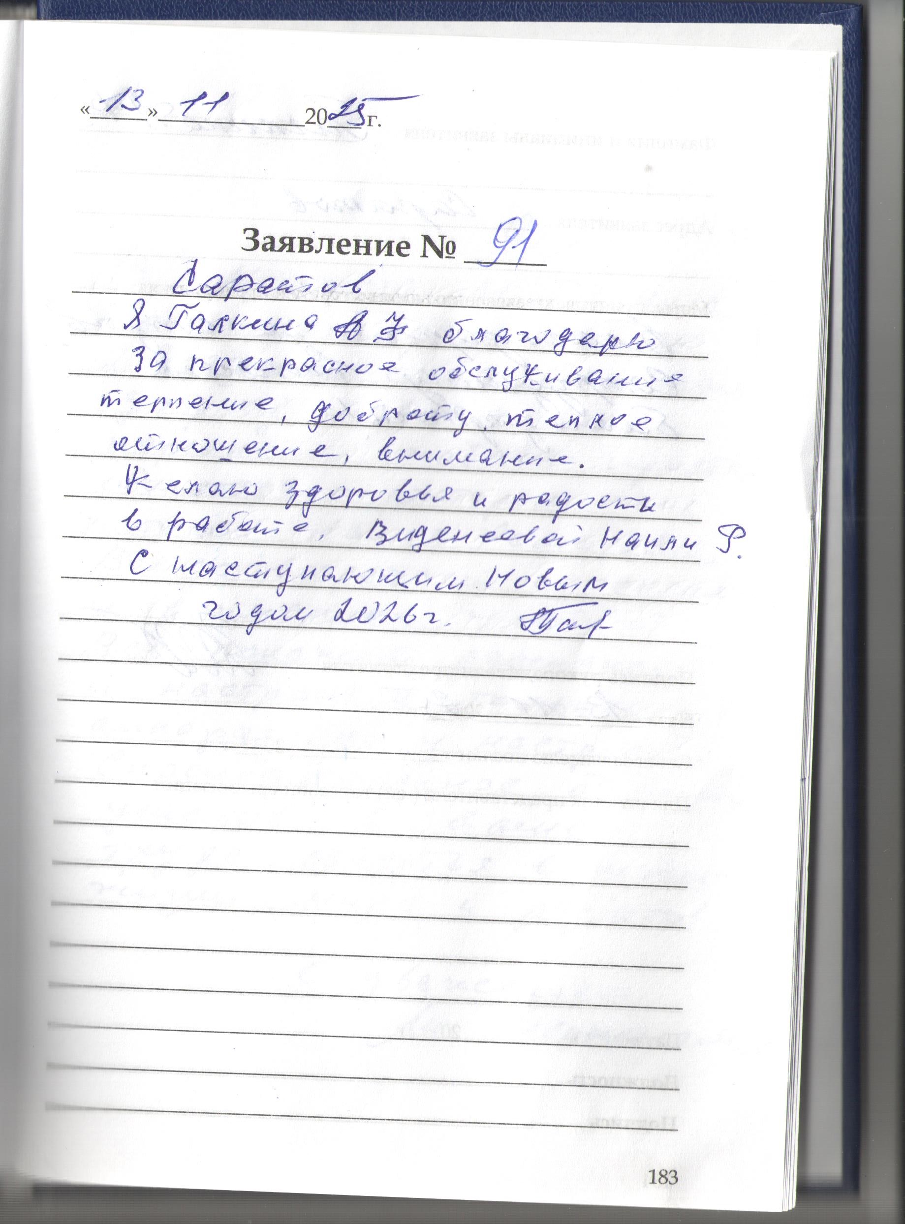Я, Галкина А.Ф., благодарю за прекрасное обслуживание, терпение, доброту, теплое отношение, внимание. Желаю здоровья и радости в работе Виденеевой Наиле Р. С наступающим новым годом 2026