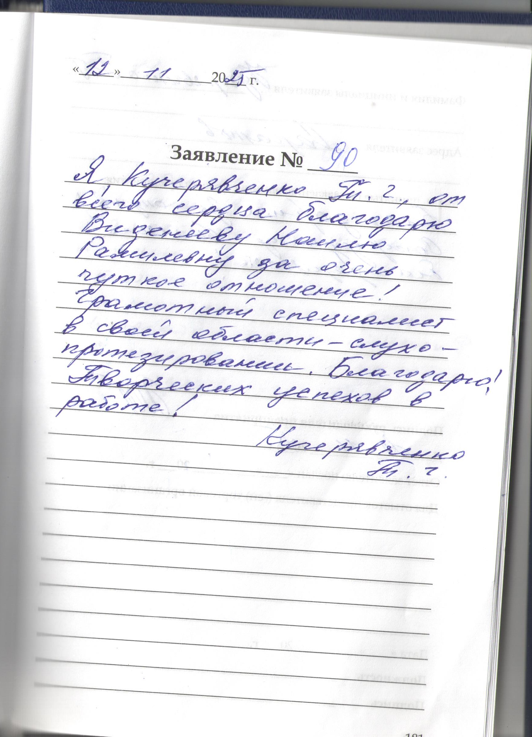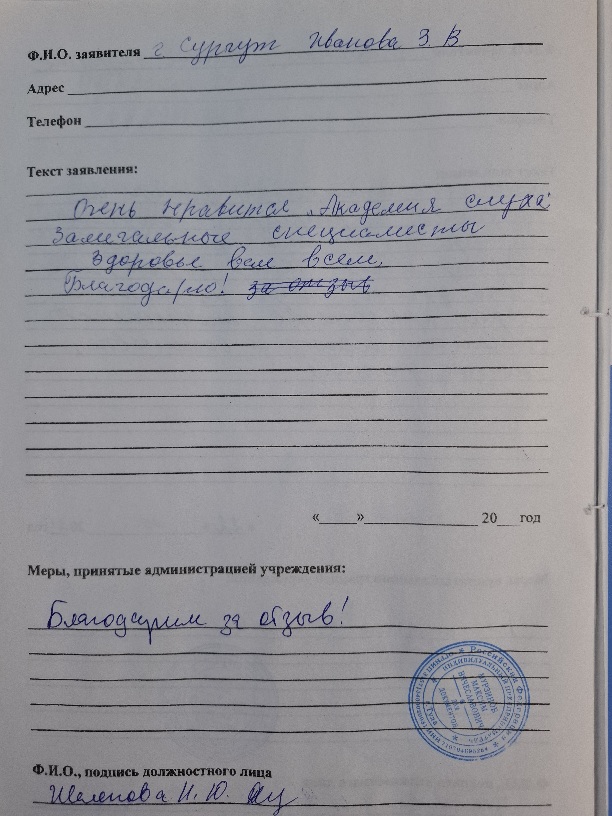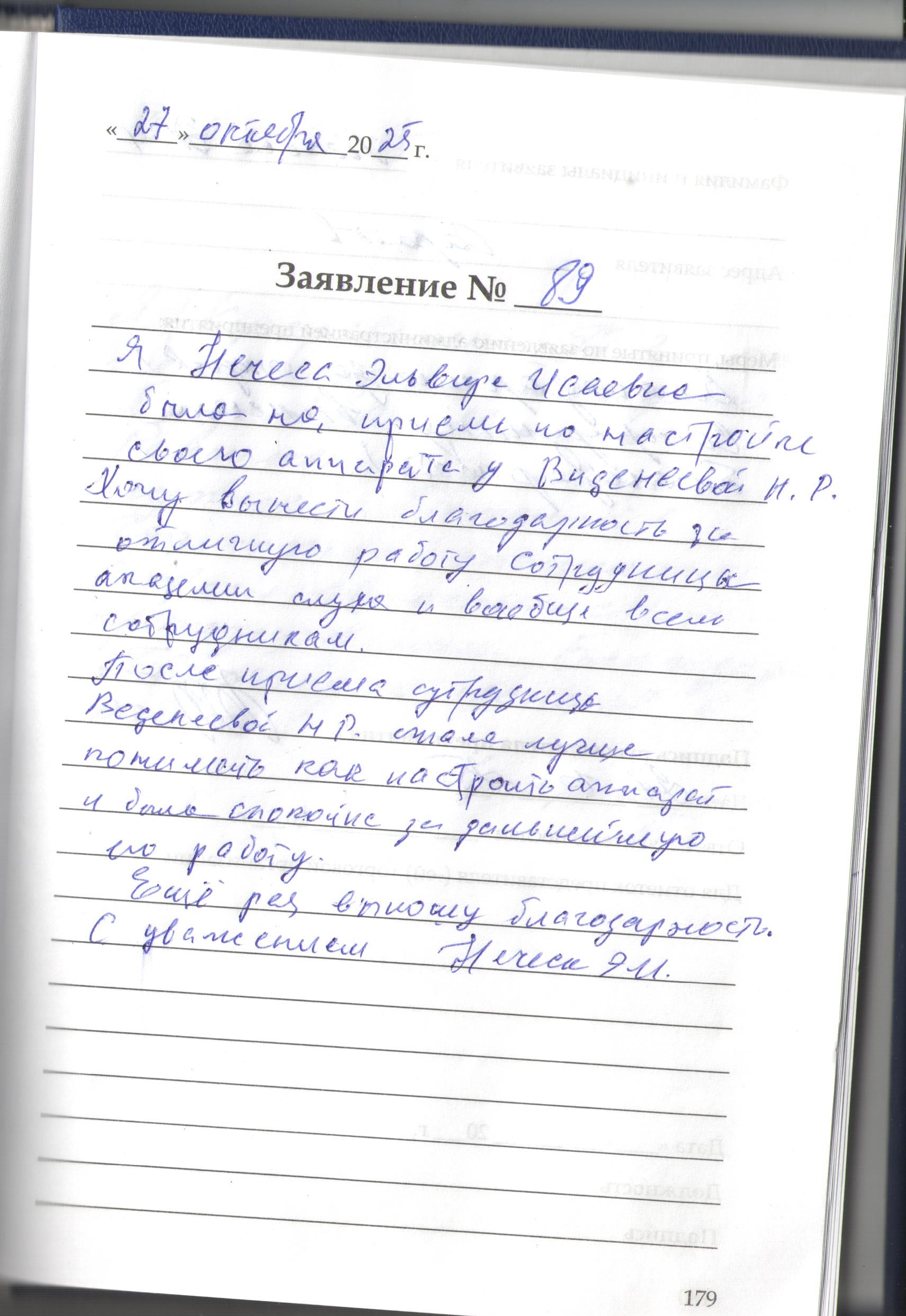 Я, Нечеса Эльвира Исаевна, была на приеме по настройке своего аппарата у Виденеевой Н.Р. Хочу вынести благодарность за отличную работу сотрудницы "Академии Слуха" и вообще всем сотрудникам. После приема сотрудницы Виденеевой Н.Р стала лучше понимать как настроить аппарат и была спокойна за дальнейшую его работу. Еще раз выношу благодарность. С уважением Нечеса Э.И.