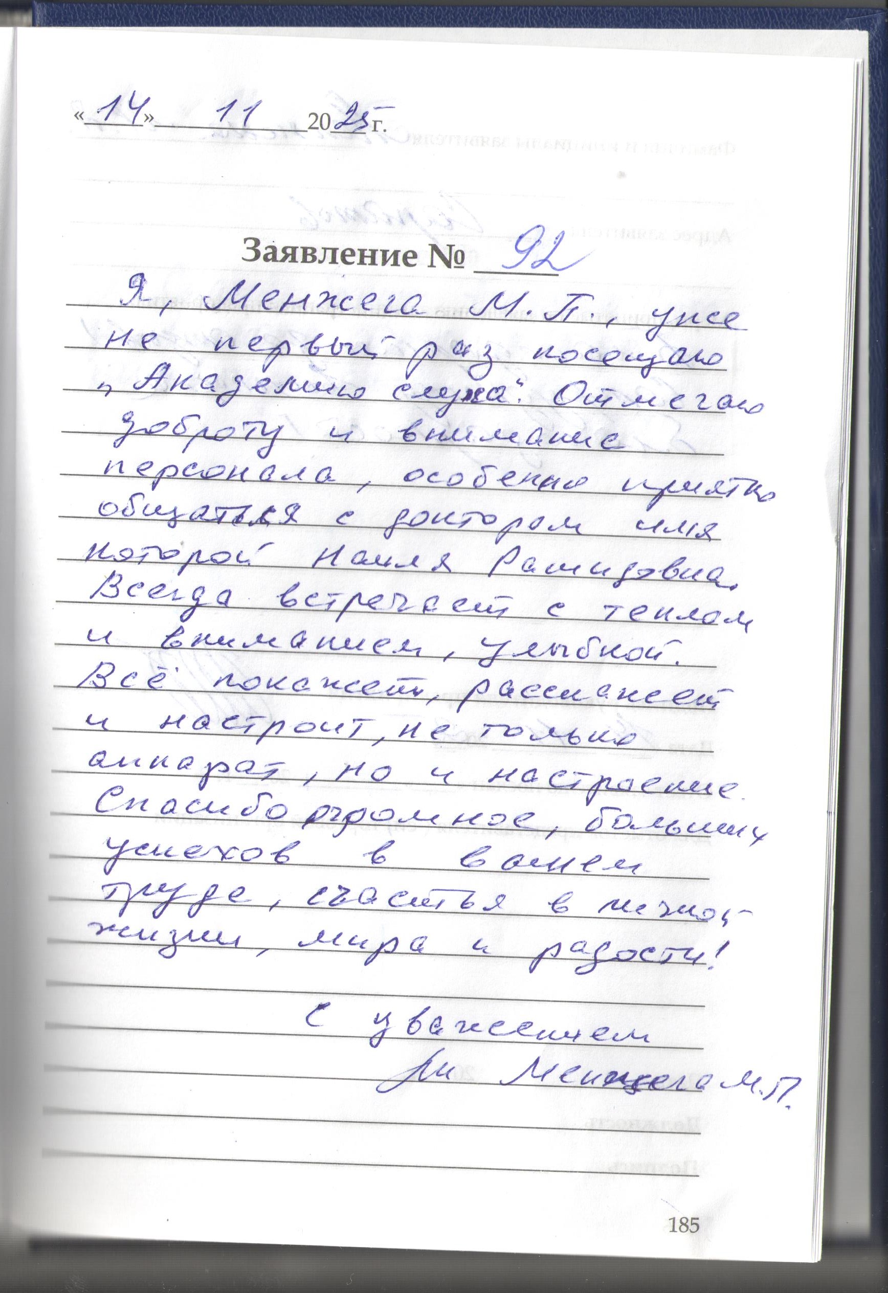 Я, Менжега М.П., уже не первый раз посещаю "Академию Слуха". Отмечаю доброту и внимание персонала, особенно приятно общаться с доктором, имя которой Наиля Рамилевна. Всегда встречает с теплом и вниманием, улыбкой. Все покажет, расскажет настроит, не только аппарат, но и настроение. Спасибо огромное, больших успехов в вашем труде, счастья в личной жизни, мира и радости! С уважением Менжега М.П.
