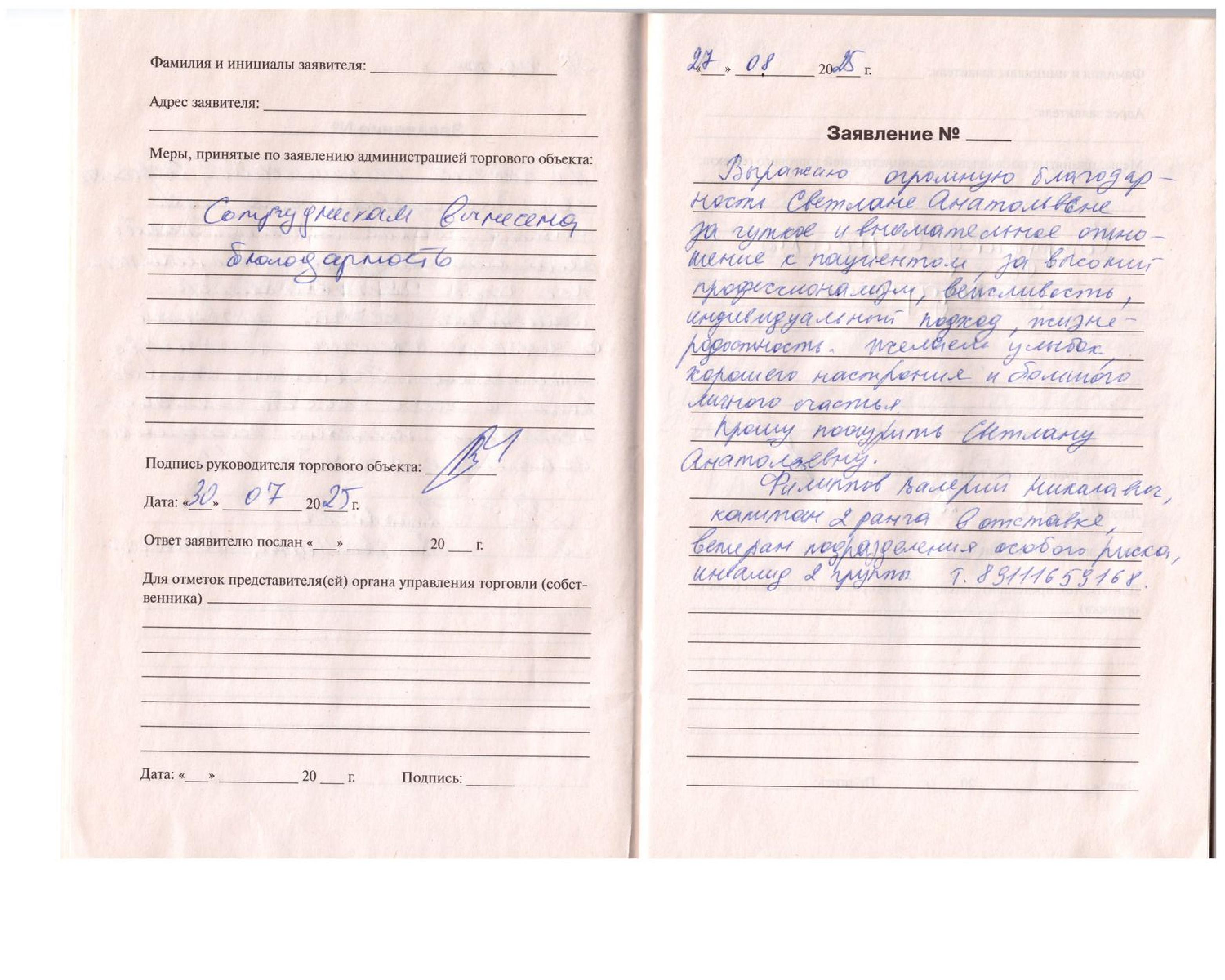 Выражаю огромную благодарность Светлане Анатольевне за чуткое и внимательное отношение к пациентам,за высокий профессионализм,вежливость,индивидуальный подход,жизнерадостность.Желаем улыбок,хорошего настроения и большого личного счастья.