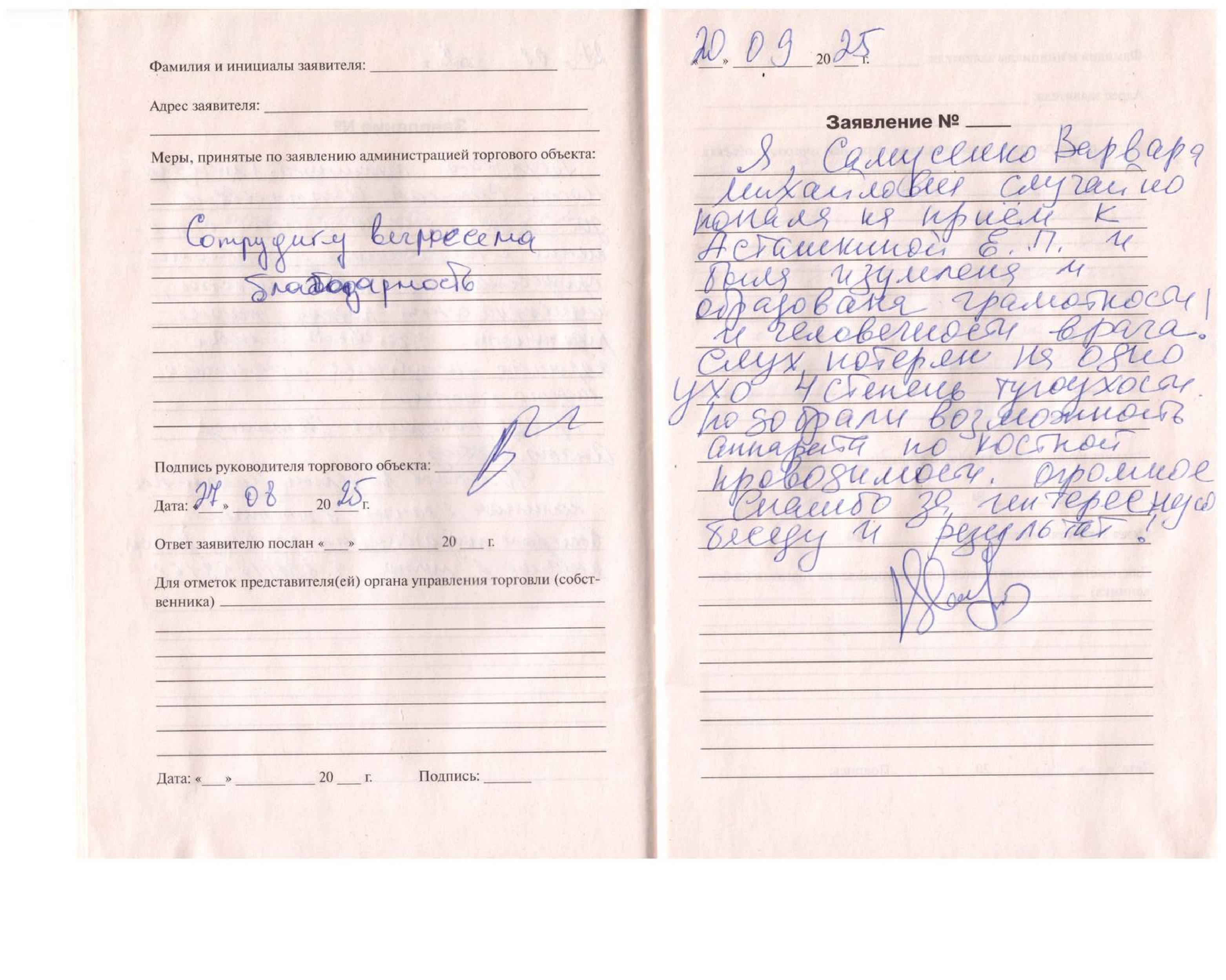 Я,Самусенко Варвара Михайловна случайно попала на прием к Асташкиной Е.П. и была изумлена и обрадована грамотности и человечности врача! Слух потерян на одно ухо 4 степень тугоухости. Подобрали возможность аппарата по костной проводимости. Огромное Спасибо за интересную беседу и результат!