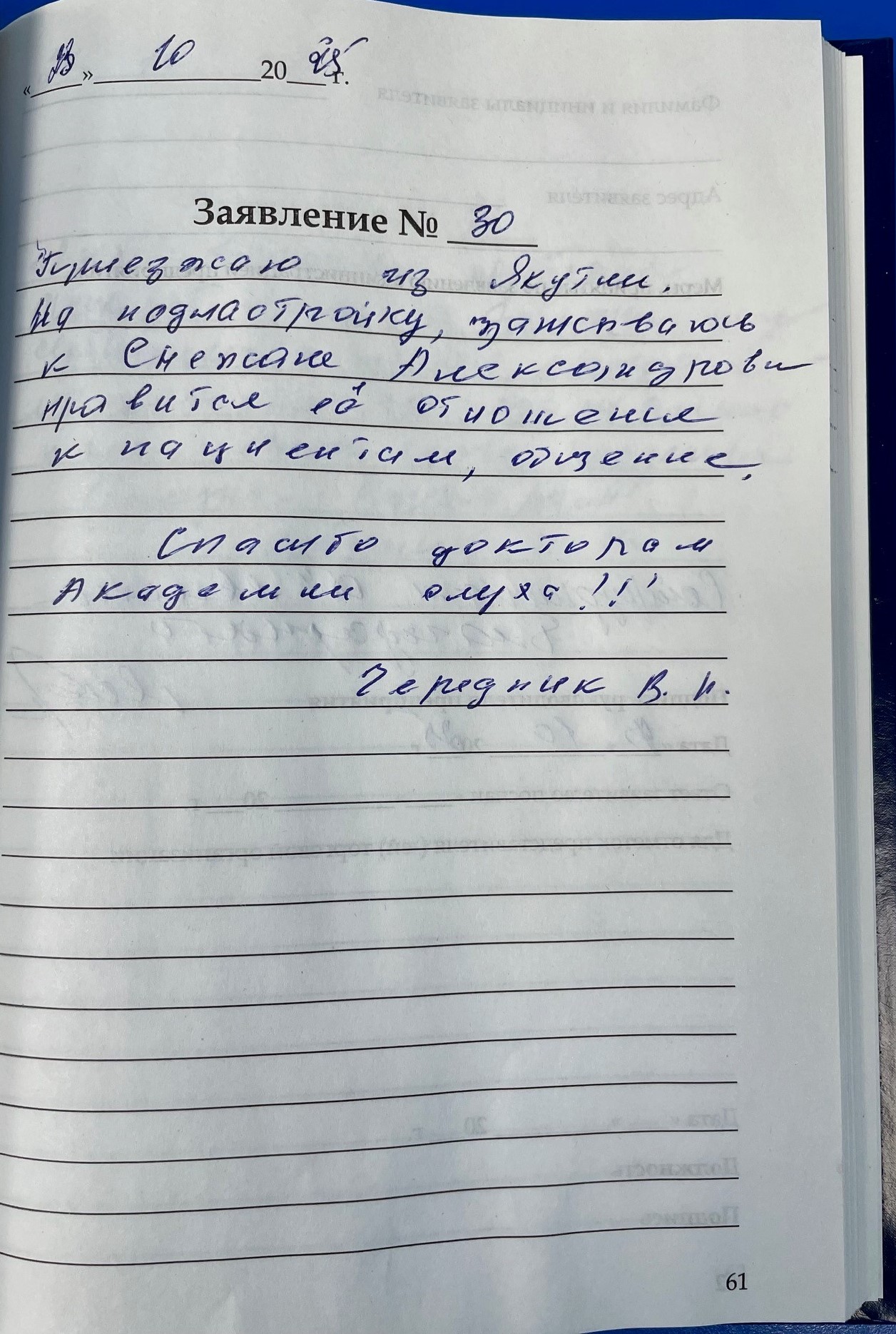 Приезжаю из Якутии. На поднастройку записываюсь к Снежане Александровне, нравится её отношение к пациентам, общение. Спасибо докторам Академии слуха!!