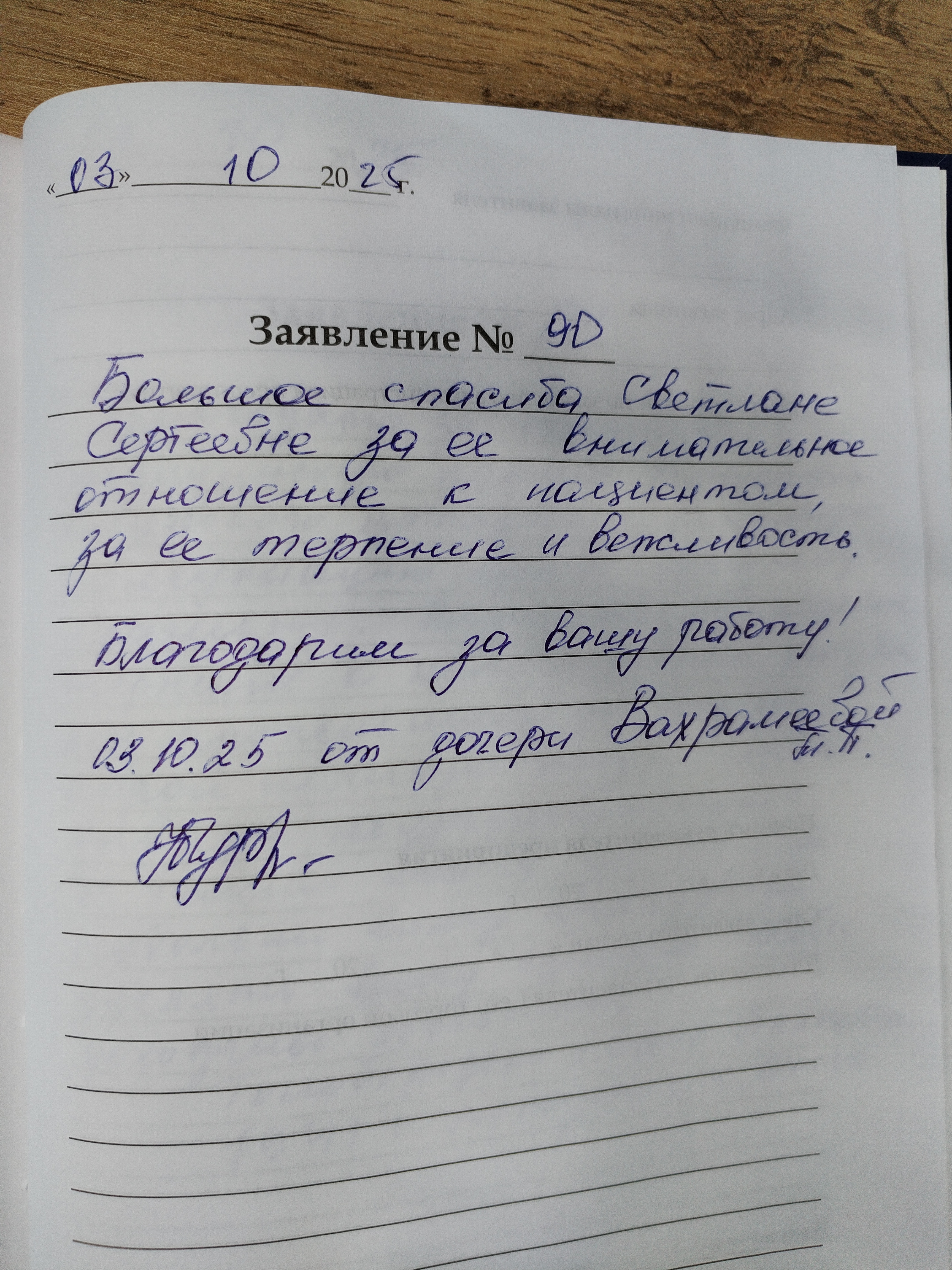 Большое спасибо Светлане Сергеевне за ее внимательное отношение к пациентам, за ее терпение и вежливость. Благодарим за вашу работу!