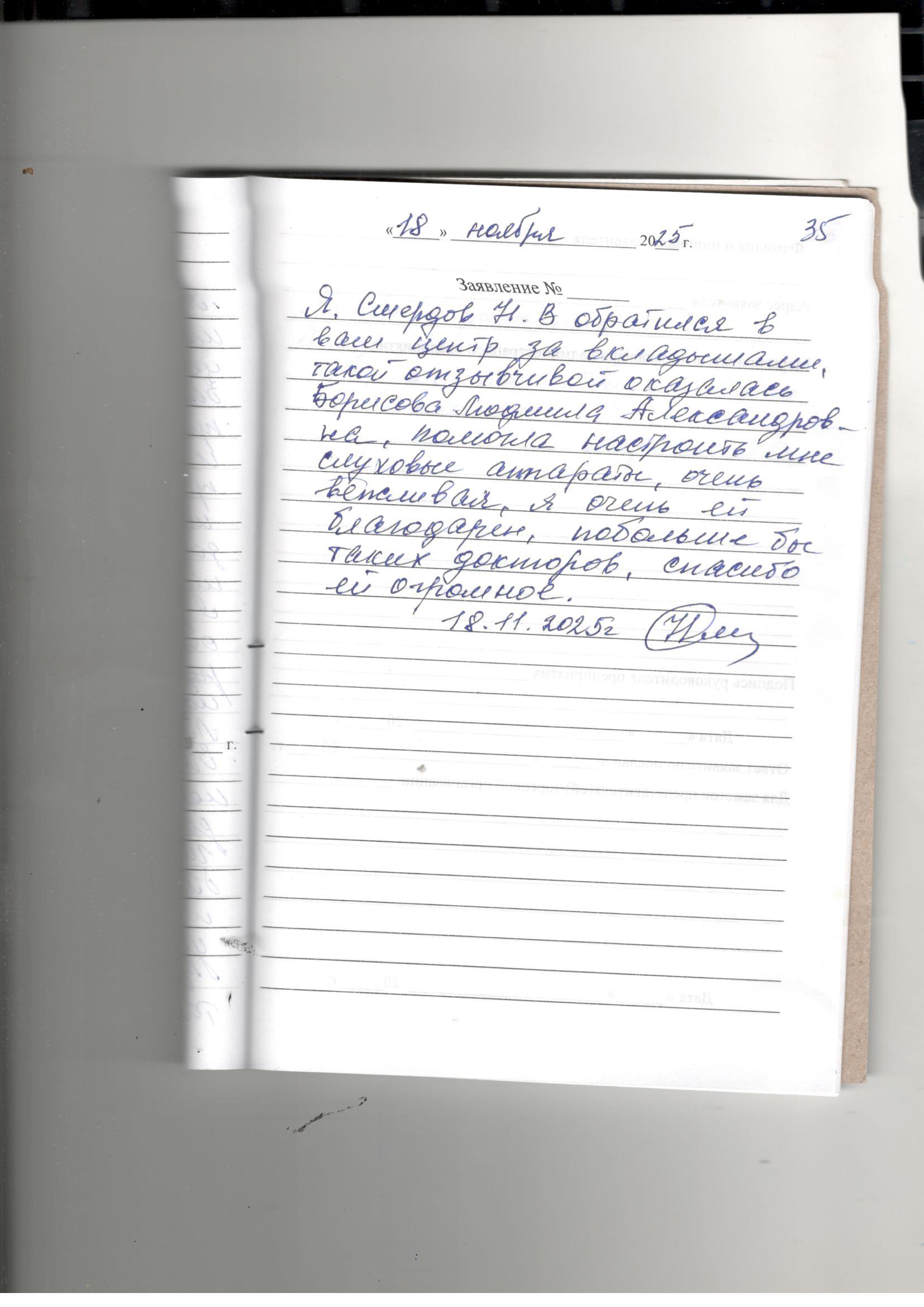 Я, Смердов Н.В обратился в ваш центр за вкладышами, такой отзывчивой оказалась Борисова Людмила Александровна, помогла настроить мне слуховые аппараты, очень вежливая, я очень ей благодарен, побольше бы таких докторов, спасибо ей огромное.