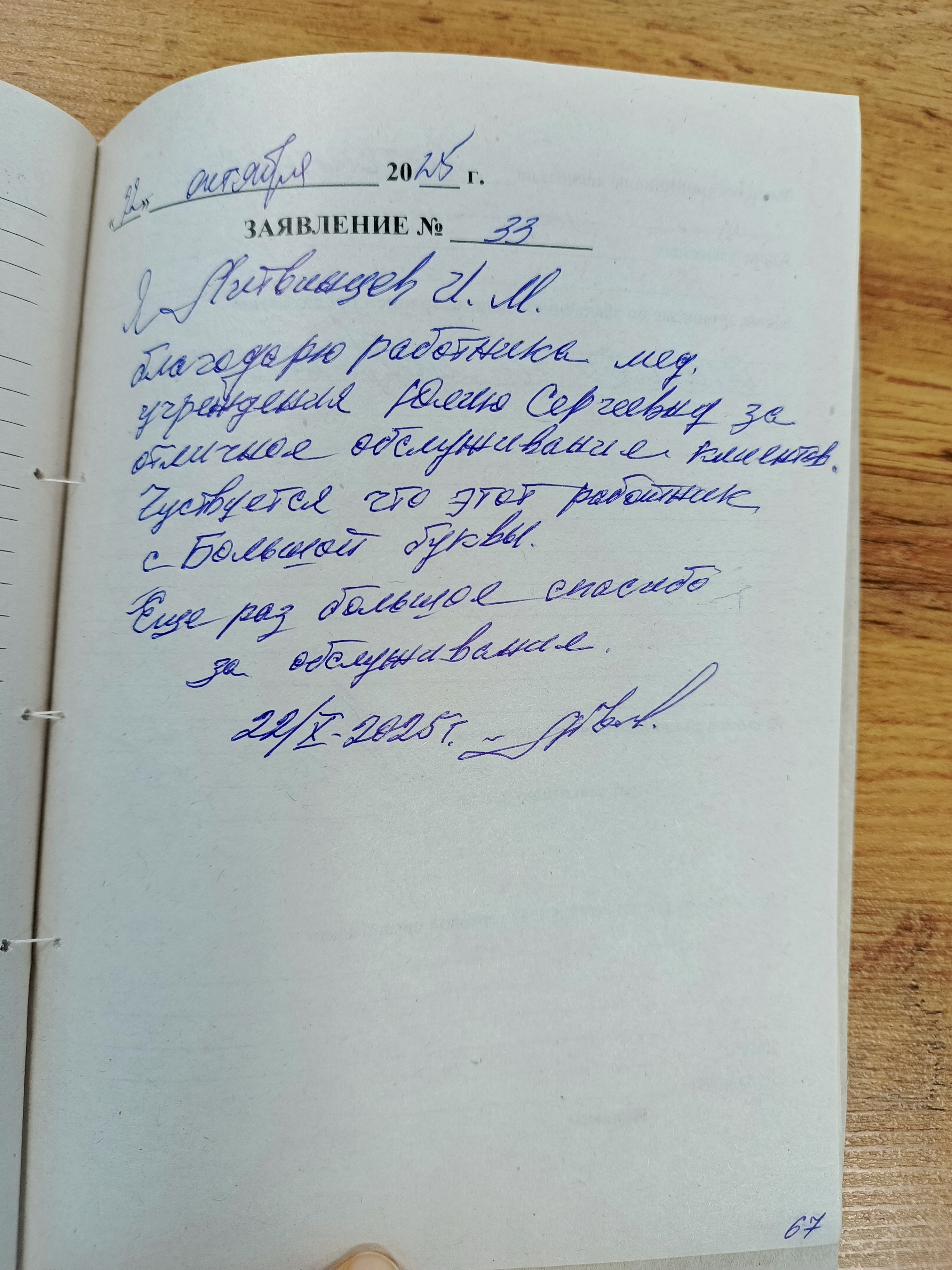 Я, Литвинцев И.М. , благодарю работника мед. учреждения Юлию Сергеевну за отличное обслуживание клиентов. Чувствуется, что этот работник с Большой буквы. Еще раз большое спасибо за обслуживание.