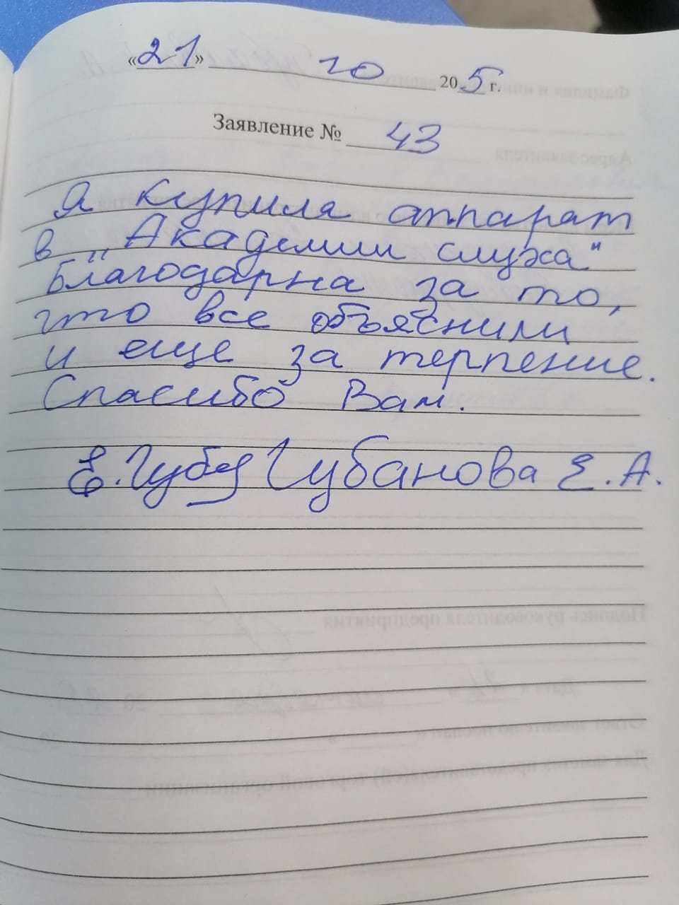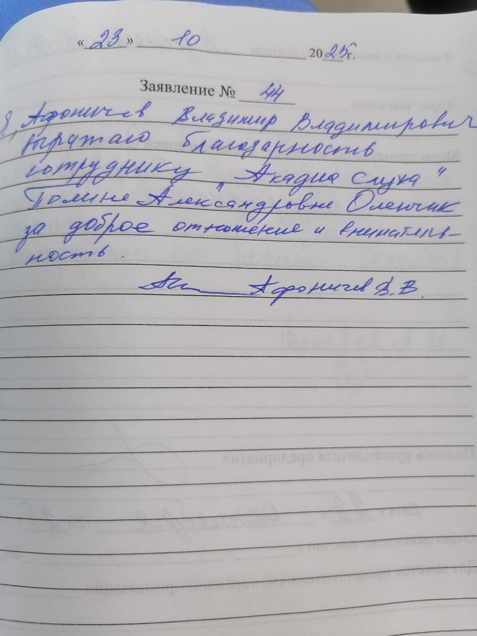Хочу сказать большое спасибо работникам Академии Слуха, за их чуткое отношение и внимательный подход к нам инвалидам.