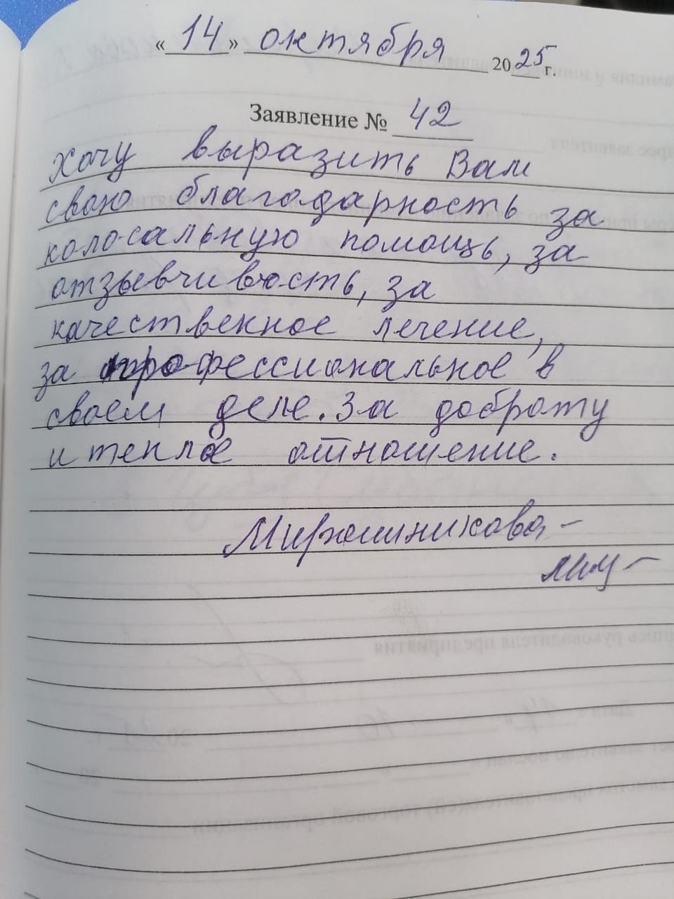 Хочу выразить Вам свою благодарность за колоссальную помощь,за отзывчивость, за качественное лечение, за профессиональное в своем деле,за доброту и теплое отношение.