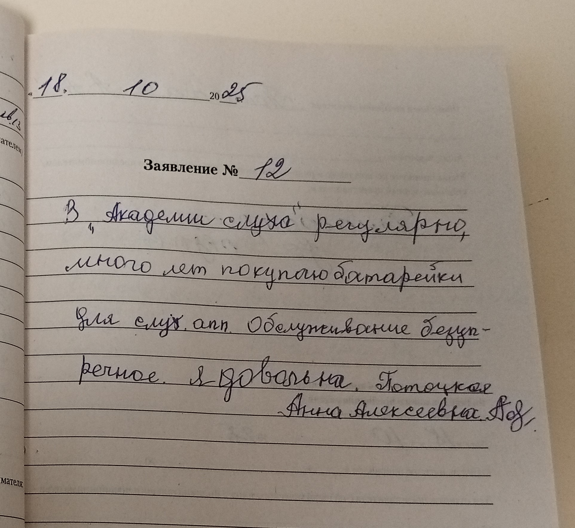 В "Академии слуха" регулярно, много лет покупаю батарейки для слух. апп. Обслуживание безупречное. Я довольна. Потоцкая Анна Алексеевна