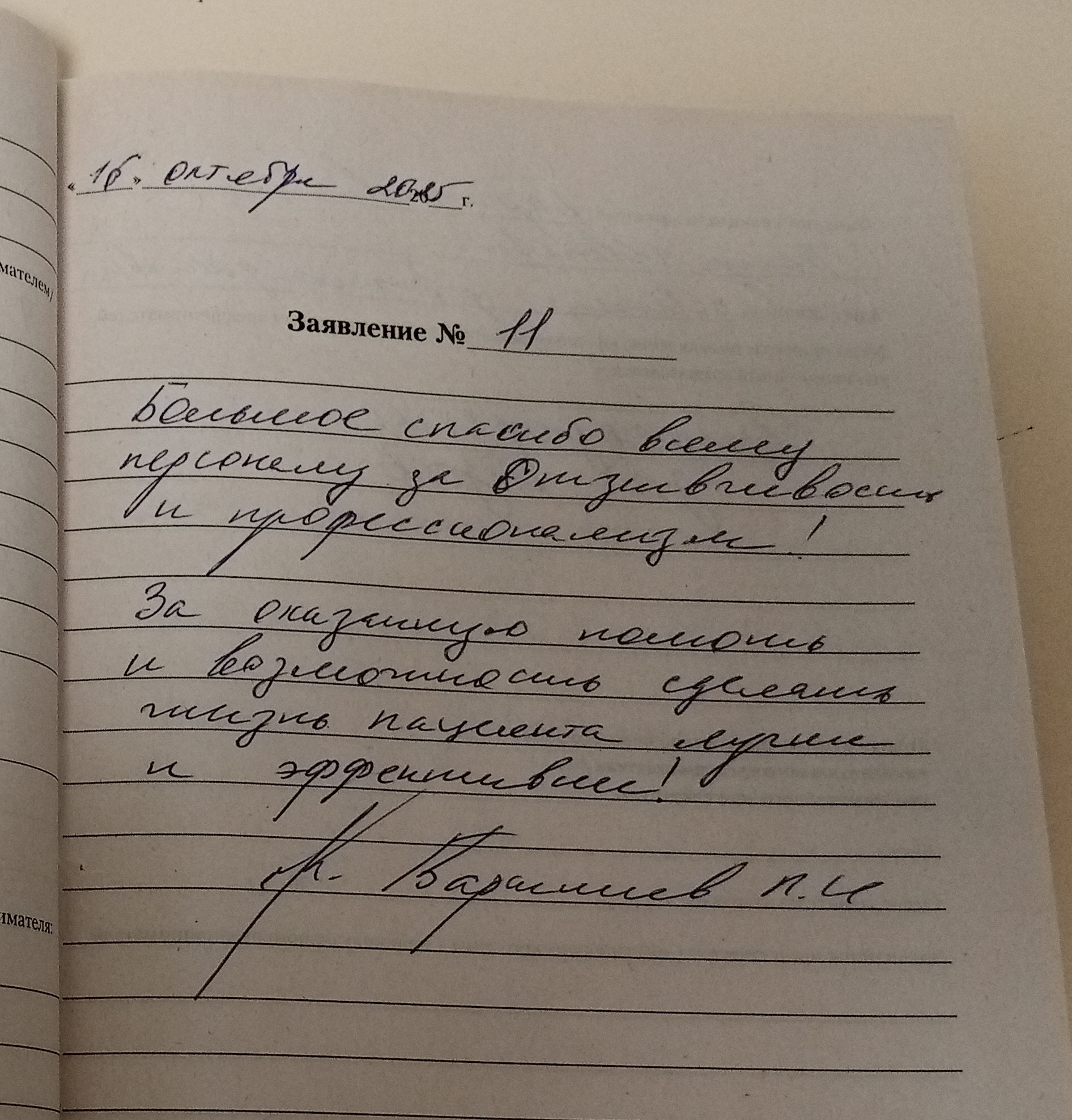 Большое спасибо всему персоналу за отзывчивость и профессионализм! За оказанную помощь и возможность сделать жизнь пациента лучше и эффективнее! Барышев П.И.